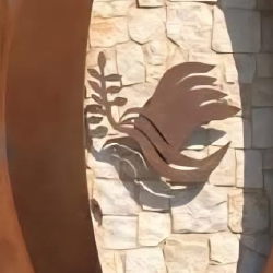 הקיר המפוסל בעוצבת סיני עשוי פלדה, שלושה סוגי אגת וחלוקי נחל….