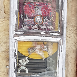 הטריפטיכון – לדברי האמניות, בחלון המרכזי רואים שני חיילים מכוונים נשק אל ציפור בעלת פני ילדה. בחלון העליון יושבת הציפור סירין על עץ פורח, פניה רגועות, גופה נוטה שמאלה וידיה מונפות. מתחת נראית אורחת גמלים עוברת במדבר….
