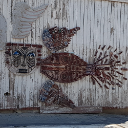 על רקע קיר העץ הלבן חוברה ציפור עץ ועליה עיטורים כמו־אפריקניים. לדברי האמניות באפריקה עיטורי הגוף הם דרך לביטוי חזותי ורוחני, המובנת לאפריקניים, אך אינה מוכרת לזרים ולכן עשויה להיות מאיימת. זנב הציפור הקטוע וקצותיו…