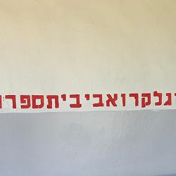יצירת חותם של תלמידי יב במהלך השנה הראשונה של מלחמת חרבות ברזל. התלמידים בחרו ליצור מסר מעודד – "עם הנצח לא מפחד מדרך ארוכה". כל תלמיד יצר אריח בנפרד, וביחד יוצרים האריחים עבודת אמנות משותפת….