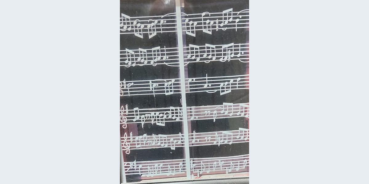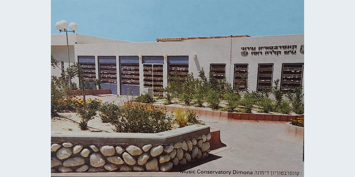 על סורגי החלונות של המבנה תווים מתוך "אמנות הפוגה" של באך ועל השערים – תווים מתוך ה"מגניפיקאט" שלו. את העבודה תכננו יהודה פרידלנד ויוסי הרטמן וביצעו האחים לאון ואלי עזריה במסגריית "אומן" בדימונה (מן השלט נשמט שמו של לאון עזריה).