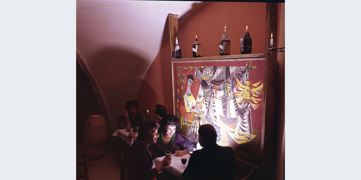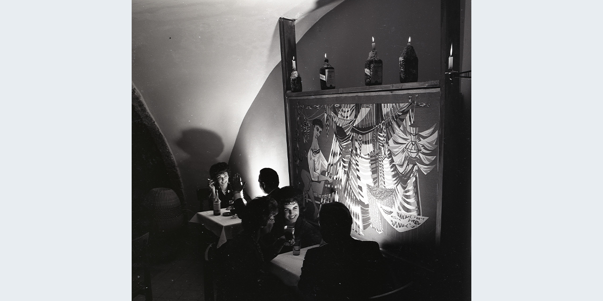 התצלום של מועדון החמאם ביפו בשנות השישים, וברקע ציור, שהוא כנראה תפאורה. זהו העתק של הציור הידוע "הדייג מתקן את הרשת" של הצייר הצרפתי Robert Debieve. ייתכן שנפתלי בזם הוא זה שצייר את העתק, שכן הרבה לצייר תפאורות להופעות בחמאם.