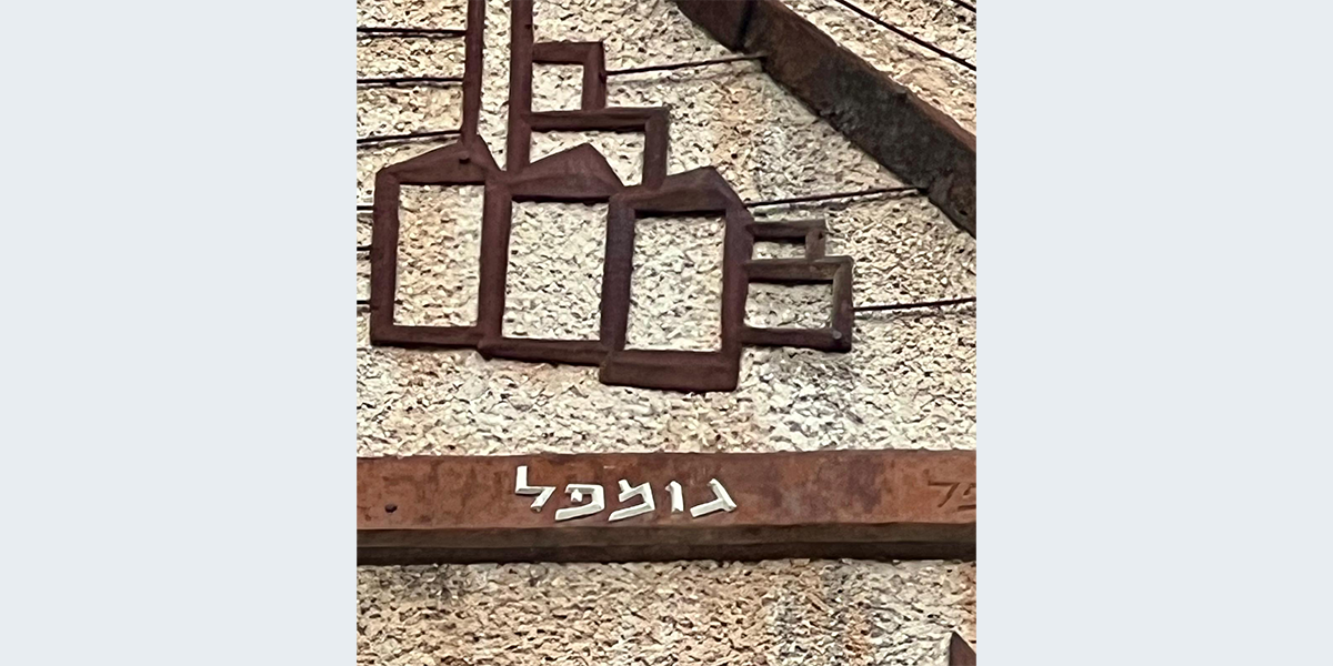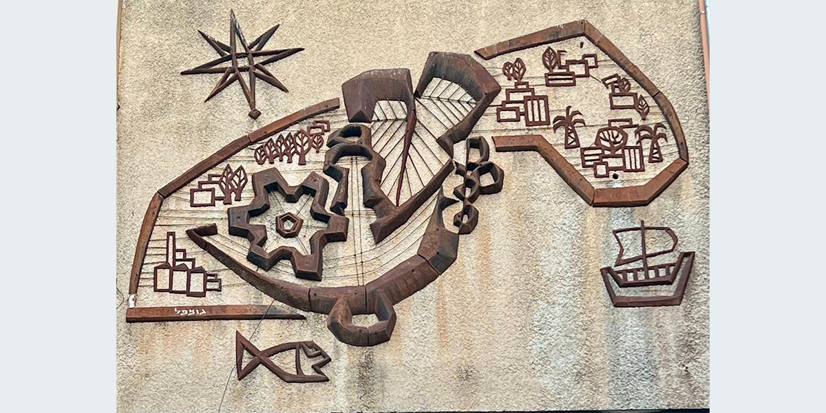 עבודה ממתכת המתארת את מאפייניה של העיר חיפה: התעשייה, הנמל והים.