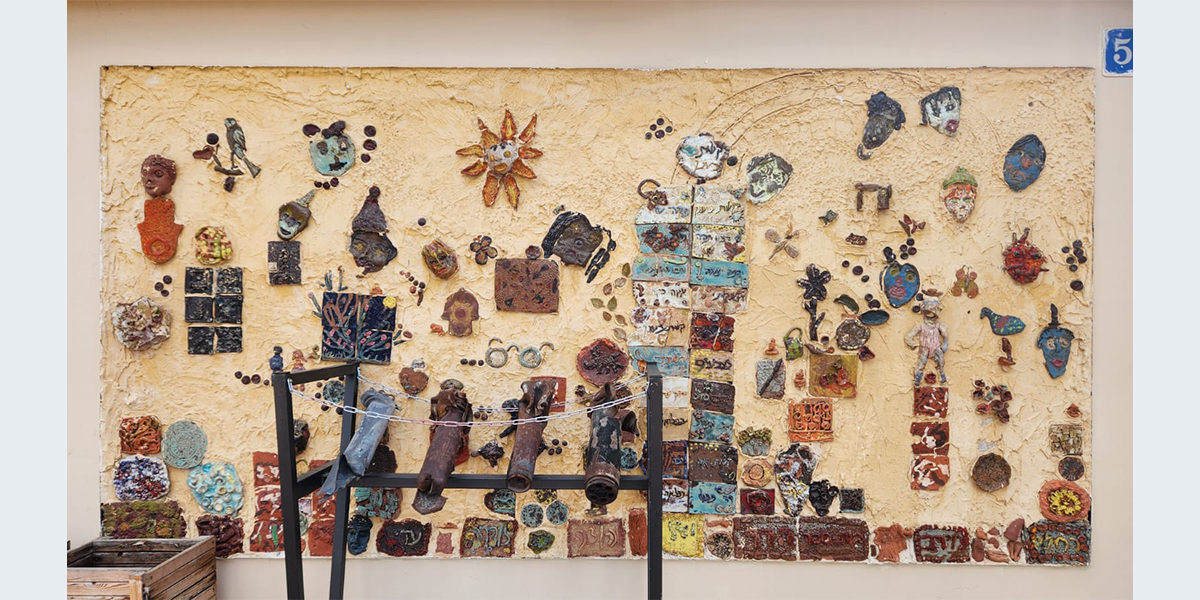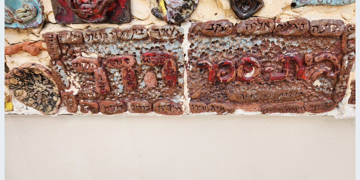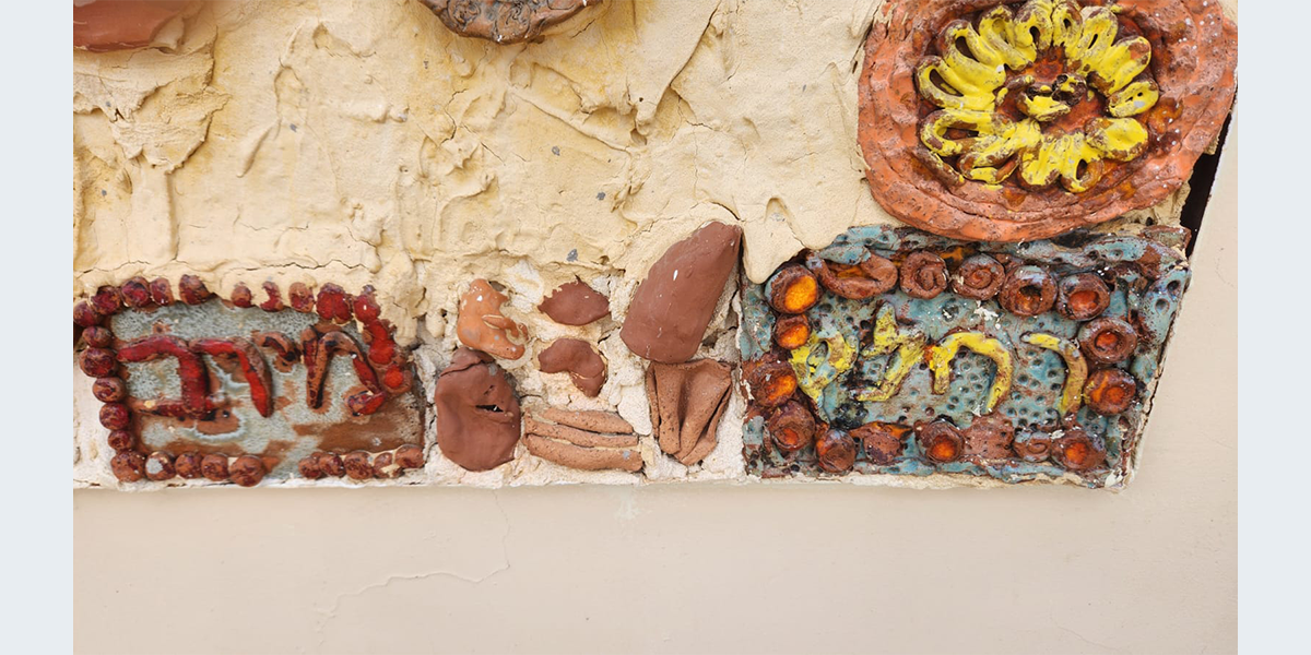 "יצירה משותפת – תבליט הקיר מבטא תהליך ארוך של יצירה במרכז קש"ת (קהילה, שינוי, תרבות) אשר שכן במבנה זה לפני שהוקם בו בית המייסדים. בתבליט מוטבעות יצירות חימר של ילדים ומבוגרים עם מוגבלות, שהיצירה הייתה עבורם דרך לביטוי אישי, לתקשורת ולחיבור בין אנשים וקהילה. לכל אחד מהפסלים מסר ומשמעות משלו, ויחד הם יוצרים שלם הגדול מסך חלקיו. ביצירה משולב גם טקסט שיר 'קשת בענן', אשר נכתב בתהליך היצירה על ידי עדי פרניקוב ז"ל", לפי אנשי בית המייסדים.