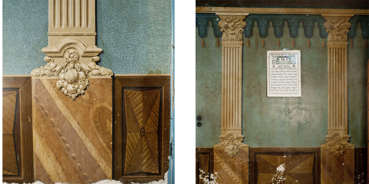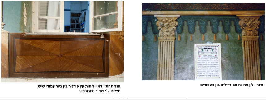 מתוך הדו"ח של "סטודיו תכלת": "בחדר המרכזי שהיה במקור חדר האורחים ומ־1960 שכן בו בית הכנסת, צוירו בסוף שנות ה־20 ציורי קיר שמעולם לא נמחקו, ובהם 14 עמודים באפקט שַיש, שמעליהם פס ציור אורנמנט בגוון נחושת ובבסיסם ציורים של משטחי עץ דקורטיבי. אלה ציורי קיר מהחשובים ביותר בארץ, כי צוירו בסוף שנות ה־20 בידי אמן ציורי חיקוי שיש ועץ ברמה גבוהה. היורשים חויבו ע"י עיריית תל אביב־יפו לשמר את ציורי הקיר רק בשטח החשוף לציבור, כלומר חדר המדרגות (ראו את הציורים בדפים 11–14 בדוח).