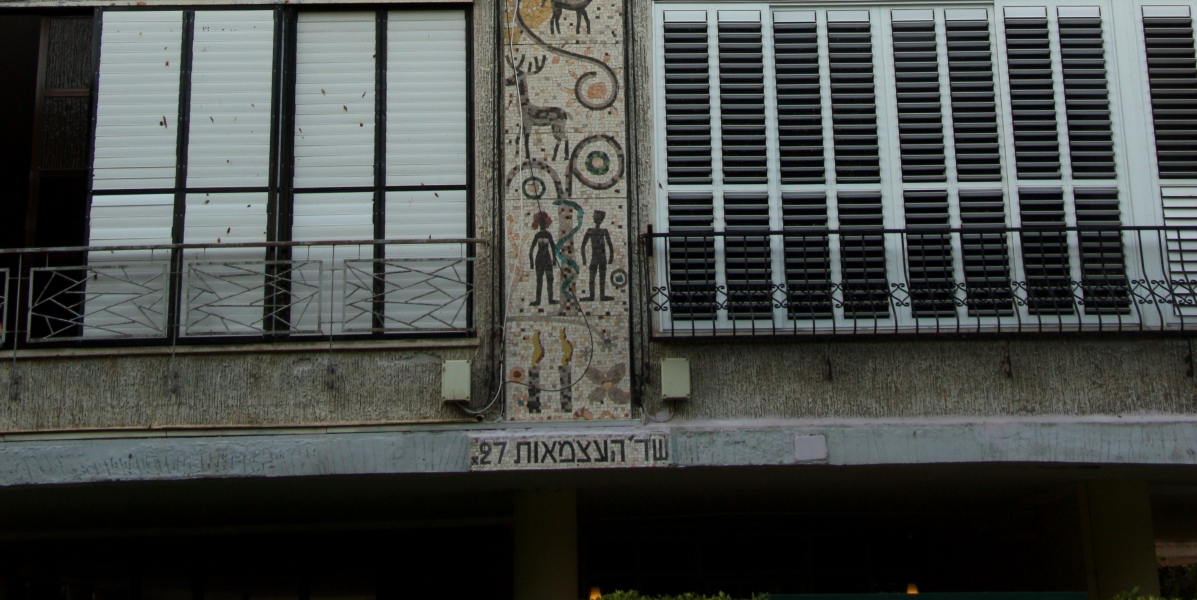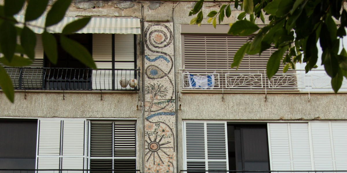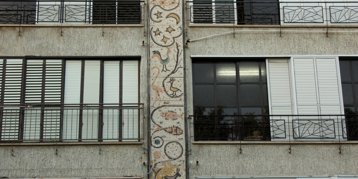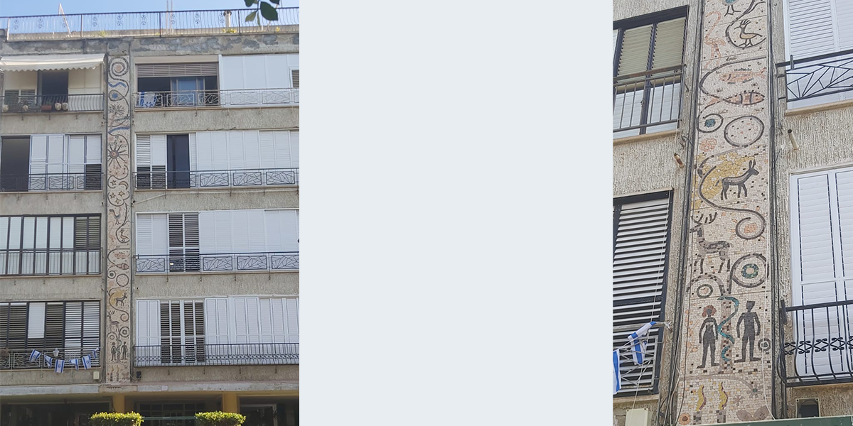 פס פסיפס המפריד בין שני טורי המרפסות ובו מתוארת בריאת העולם, החל בתוהו ובוהו וכלה בשני נרות.