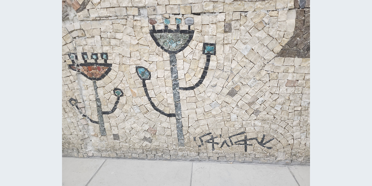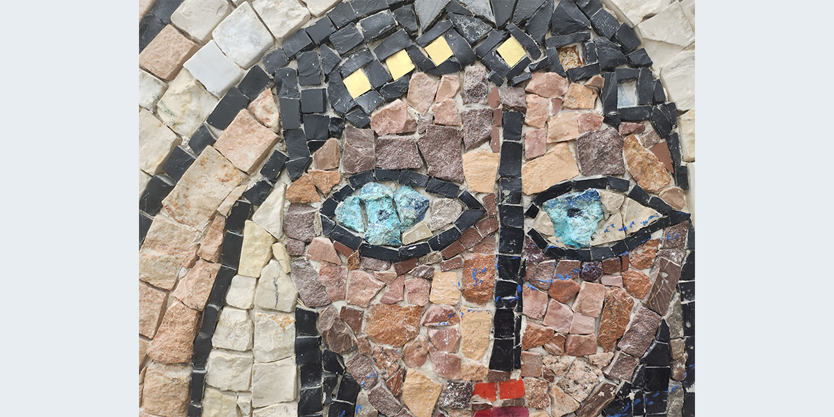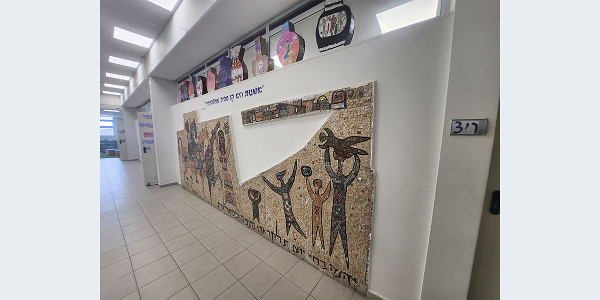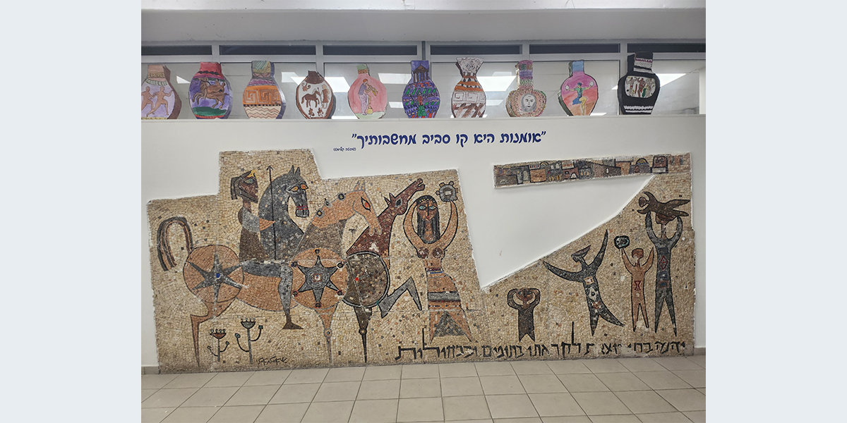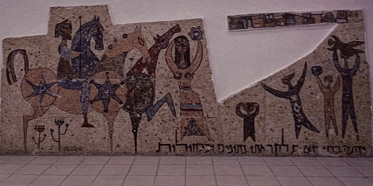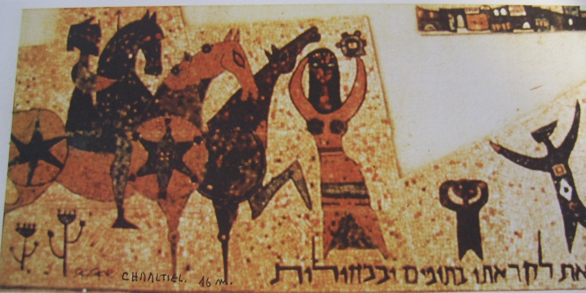 פסיפס בת יפתח היוצאת במחולות לקראת אביה, החוזר אל ביתו רכוב על סוס לאחר ניצחונו על בני עמון (שופטים יא, לד).
