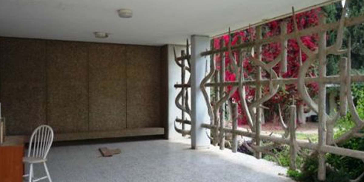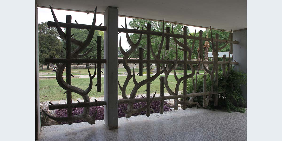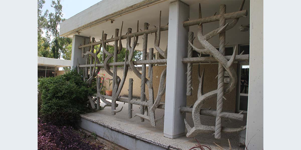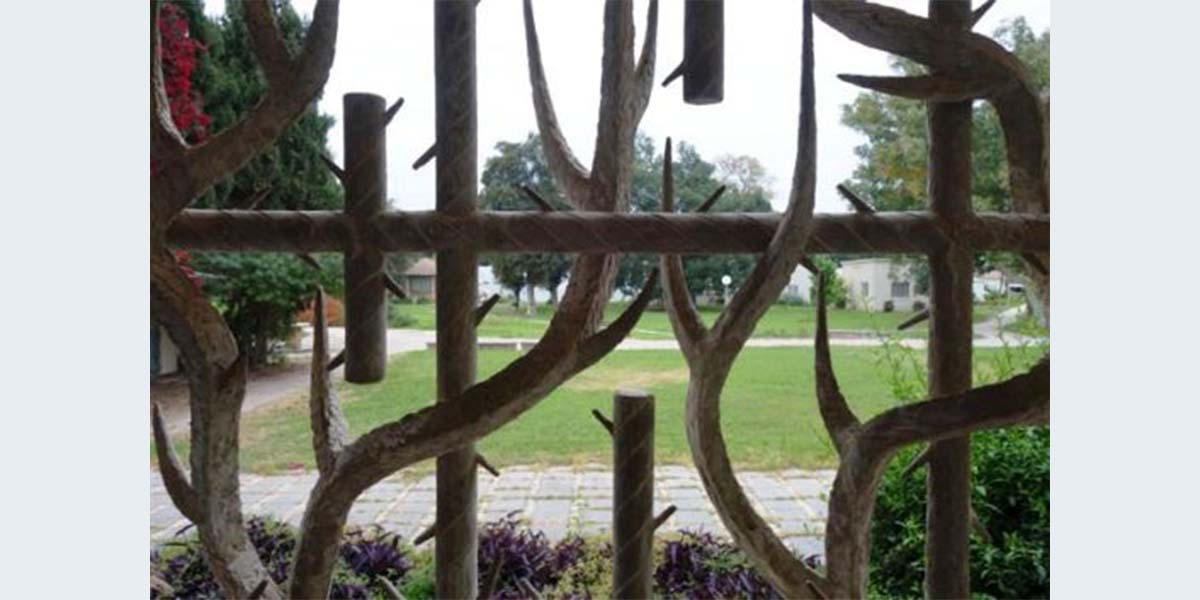 האמן פיסל בחזית הבניין סורג אמנותי הסוגר על מבואה פתוחה. את הסורג הוא עיצב באופן המזכיר גדר תיל, כמו אלה שהקיפו את מחנות הריכוז שהוקמו במלחמת העולם השנייה וכמה ממייסדי רשפים הכירו היטב. לכפרי הייתה כוונה לשלב על הקיר הרחב הנמתח בין שתי הכניסות, תבליט של אוניית מעפילים ובכך ליצור קשר בין חדר הזיכרון עם הסורג המאזכר את השואה, דרך האונייה הנושאת מעפילים לארץ ישראל ובקצה המועדון לחבר המייצג את העצמאות. התקציב ליצירת האונייה לא נמצא והעבודה לא מומשה, מיכאל יעקובסון "חלון אחורי".
