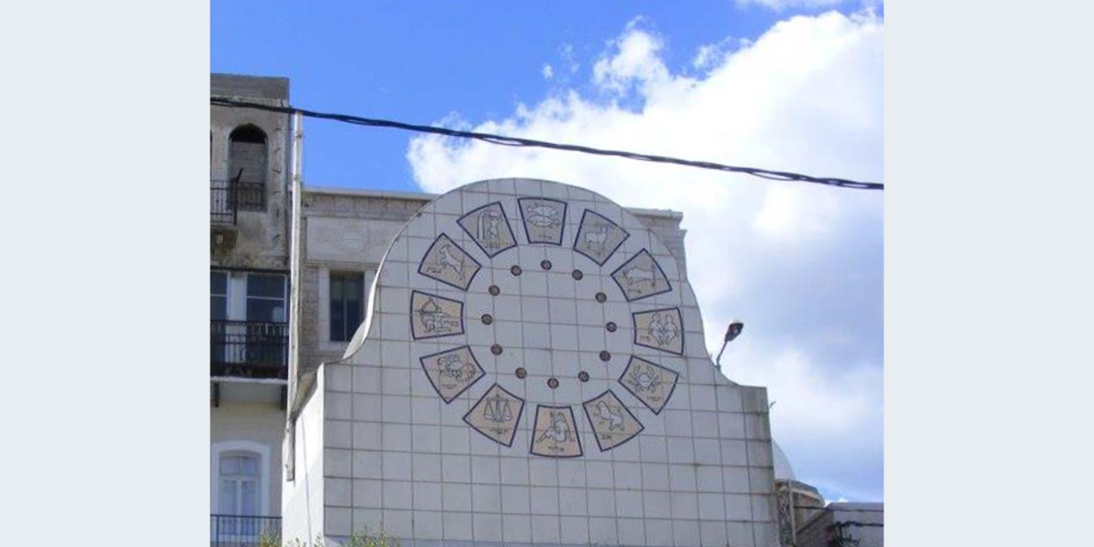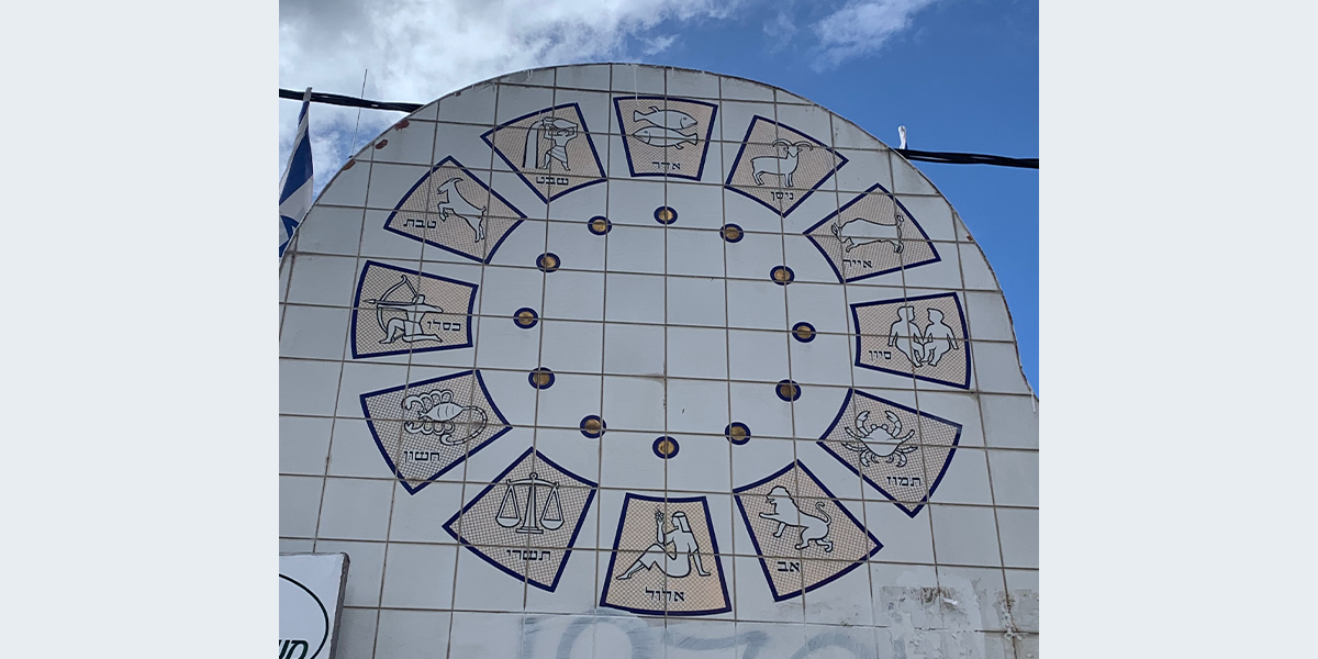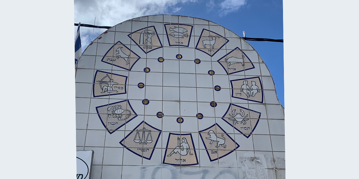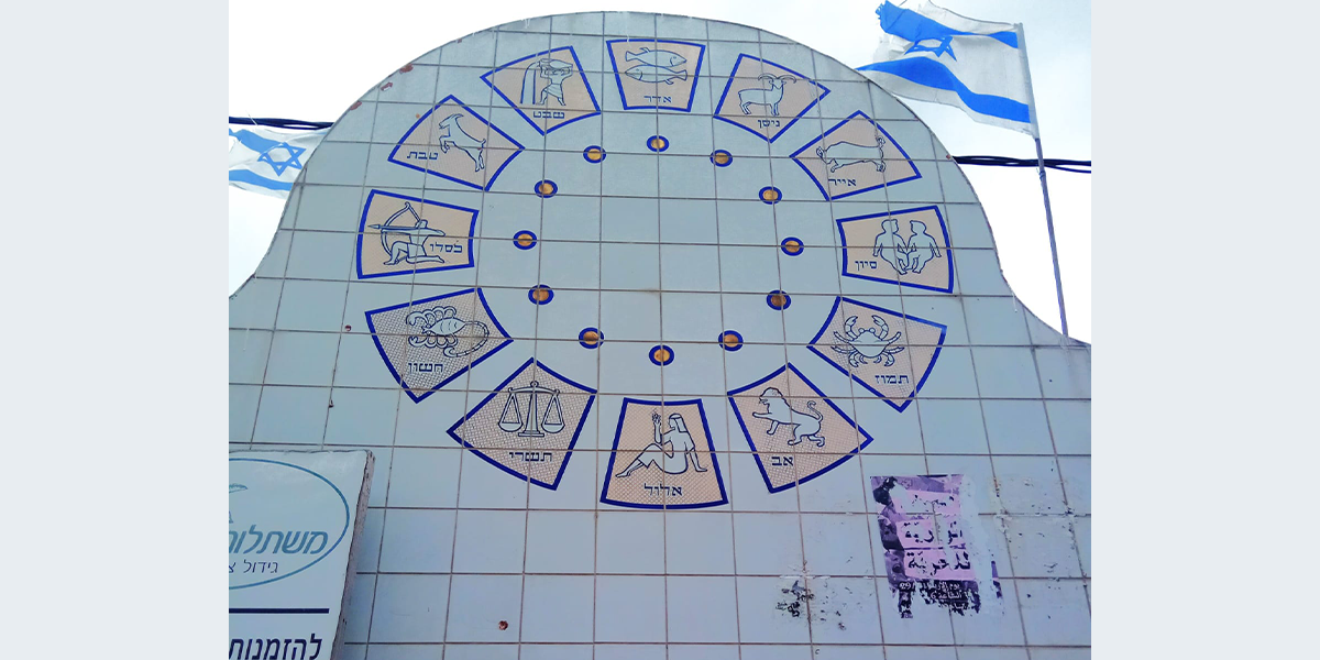 גלגל המזלות היה אמור לשמש שעון, אך המחוגים מעולם לא הורכבו. בסמלי המזלות יצרה האמנית אפקט של מוזהב.