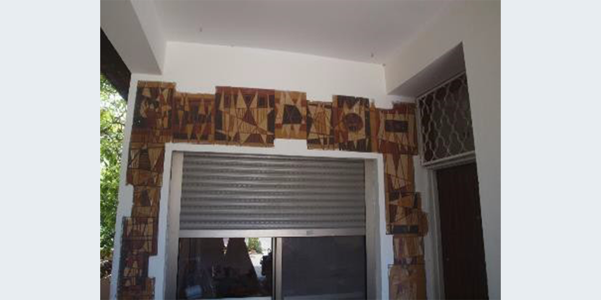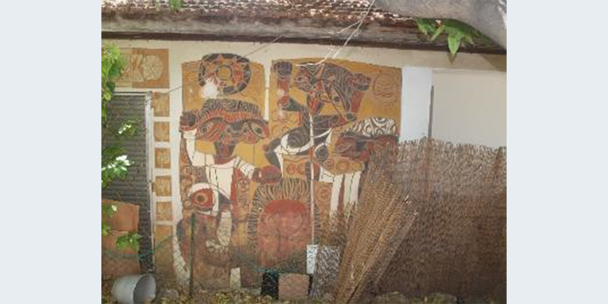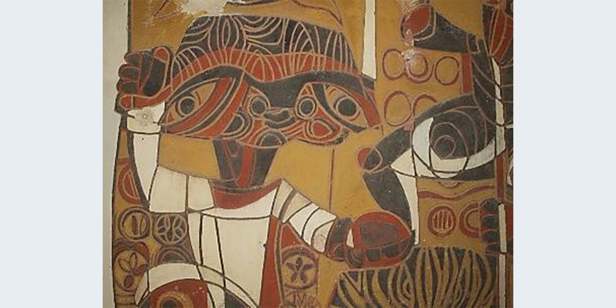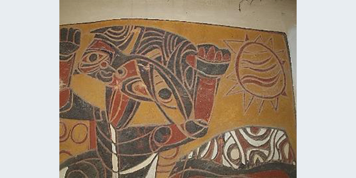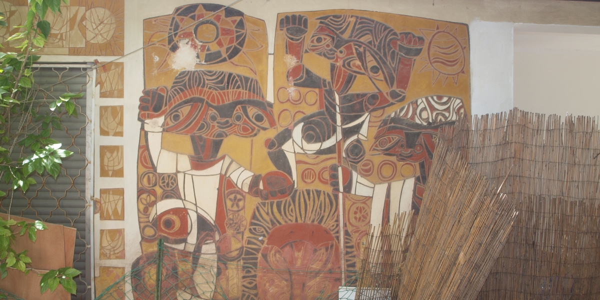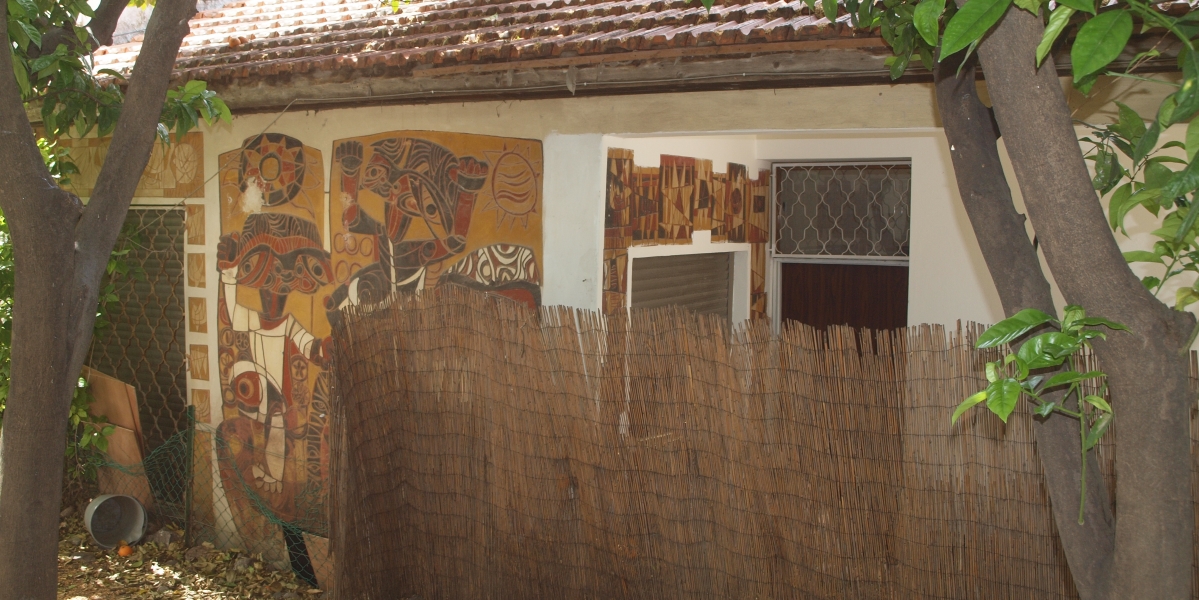 דמויות גרוטסקיות בגוונים חמים, מלווים בצורות גאומטריות וסמלים על שלושה קירות במרפסת בית האמן.