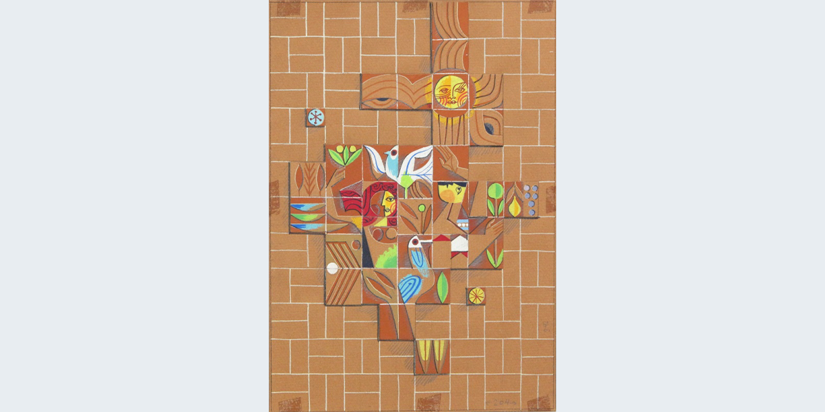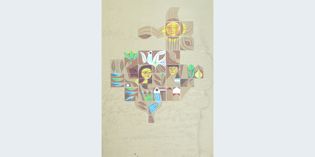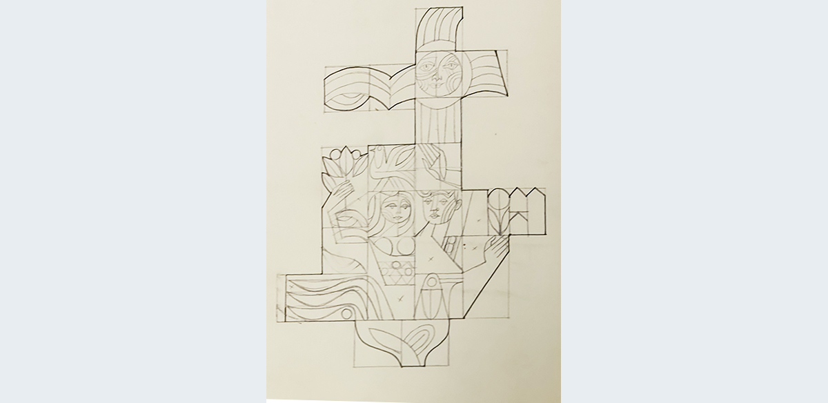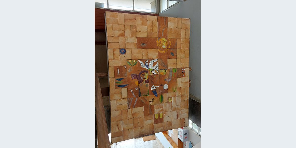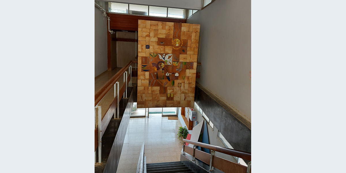 תבליט על קיר פנימי מעל גרם המדרגות בחדר האוכל בקיבוץ געתון. כיום פועל במקום אולפן מחול.