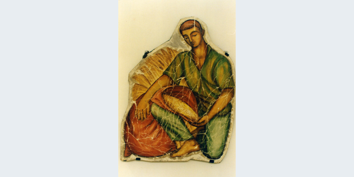 החלילן הלובש בגדי עבודה כחולים מצויר על רקע שיח ירוק. הוא יושב על האדמה בתנוחה רפויה ומחלל בחליל עץ. המתופפת לובשת שמלה בצבע אדום בהיר שקפליה עוטפים ברכוּת את ברכיה ואת זרועותיה. היא כורעת, ידה האחת אוחזת בתוף הבהיר וידה השנייה הולמת בו. היא מרוכזת, עיניה עצומות, מטפחת לבנה גדולה כרוכה סביב צווארה, תפוחה־משהו מן הרוח. מאחוריה צמח קטן הקושר את הסצֵנה לעבודת האדמה. עובד האדמה לבוש בגדי עבודה בגוונים של ירוק, חציו יושב, חציו כורע. מבטו מופנה אל שק התבואה הגדוש שמונח בין ידיו. מאחוריו נראות שיבולים עמוסות גרעינים. בני הזוג הרוקדים ניצבים זה מול זה בתנוחות פיתול מנוגדות. הם אוחזים זה את ידו של זה, והיד האחרת מתנופפת כלפי מעלה, כל אחד מהם גם מניף רגל אחת בצעדי ריקוד; פניהם שזופים, שערם חום־אדמדם והם אינם מביטים זה בזה אלא מרוכזים בתנועותיהם. הבחורה לבושה שמלה לבנה פשוטה, שקפליה העוטפים את גופה ברפיון, מתבדרים ברוח ואיתם נע הסרט על מותנהּ, והבחור לובש בגדי עבודה כחולים. רועה הצאן הלובש בגדי עבודה כחולים, נשען על מטהו ומביט אל עבר האופק, לידו עומדת כבשה המלחכת עשב ומסביבו צומחים צמחים. כל הדמויות ביצירה הן יחפות, וניכר שהן שקועות במלאכתן; איש מהם אינו מביט ישירות אל הצופה. הדמויות הנשיות שלגופן שמלה עם קפלים המתנופפים ברוח מהדהדות פסלים קלאסיים, כמו למשל הפסל ההלניסטי ניקאה מסמורתקיה (המוצג היום בלובר בפריז) העומדת מכונפת מול הרוח, שמלתה הדקה מתלפפת סביב גופה ותופחת ברוח סביבה.