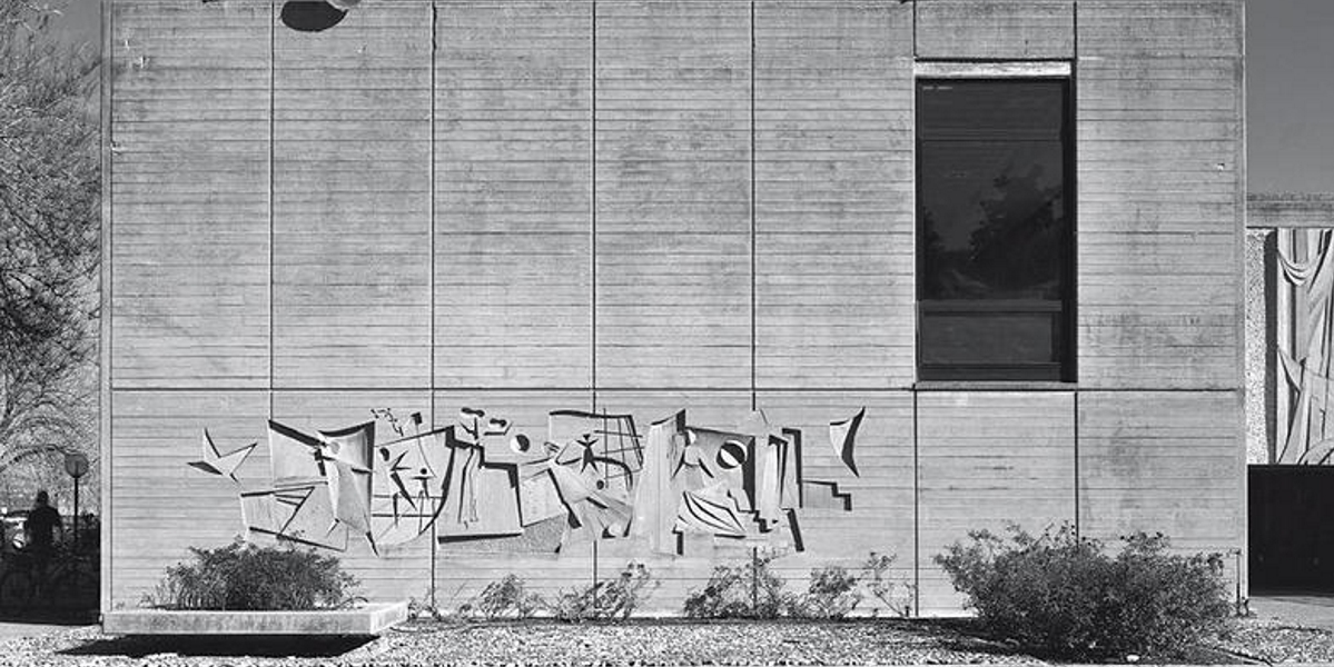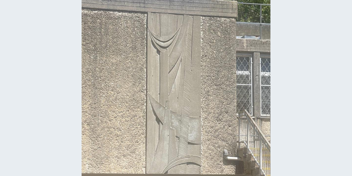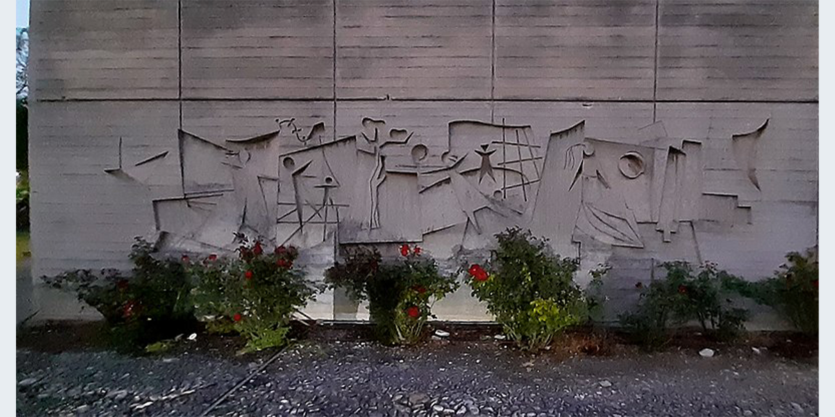 שני תבליטים על הקיר החיצוני של חדר האוכל בקיבוץ הזורע, שתוכנן בידי האדריכלים מוניו גיתאי וינרוב ואל מנספלד.