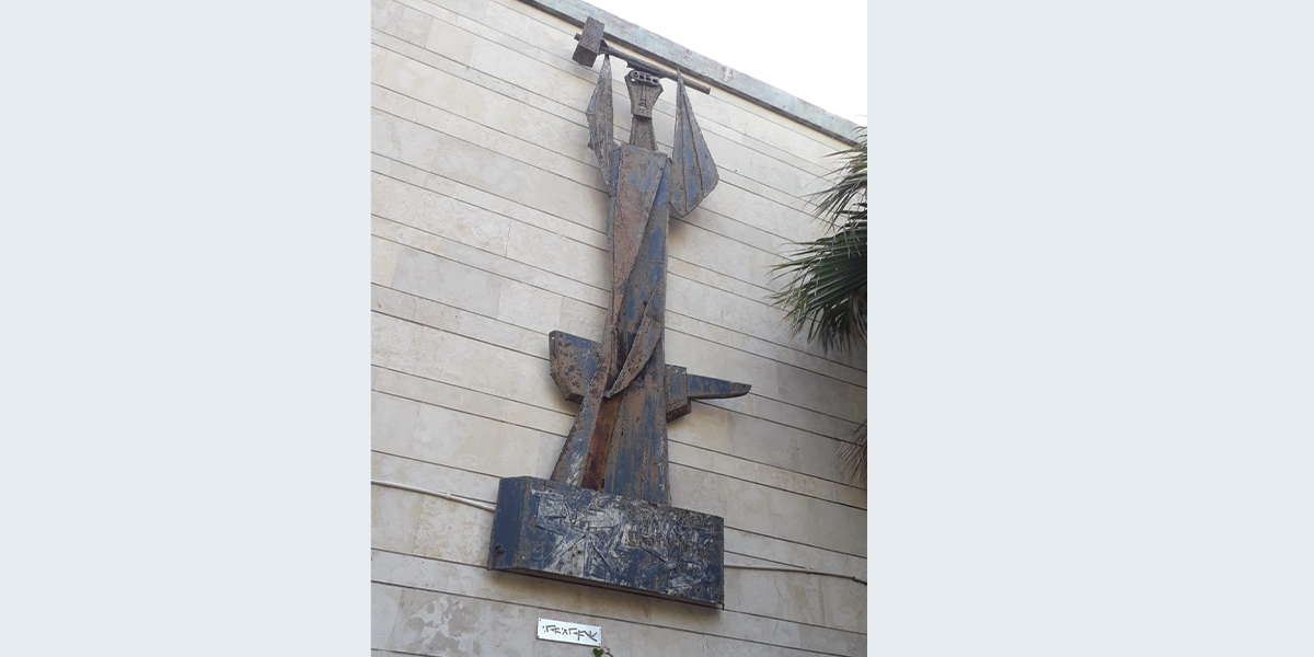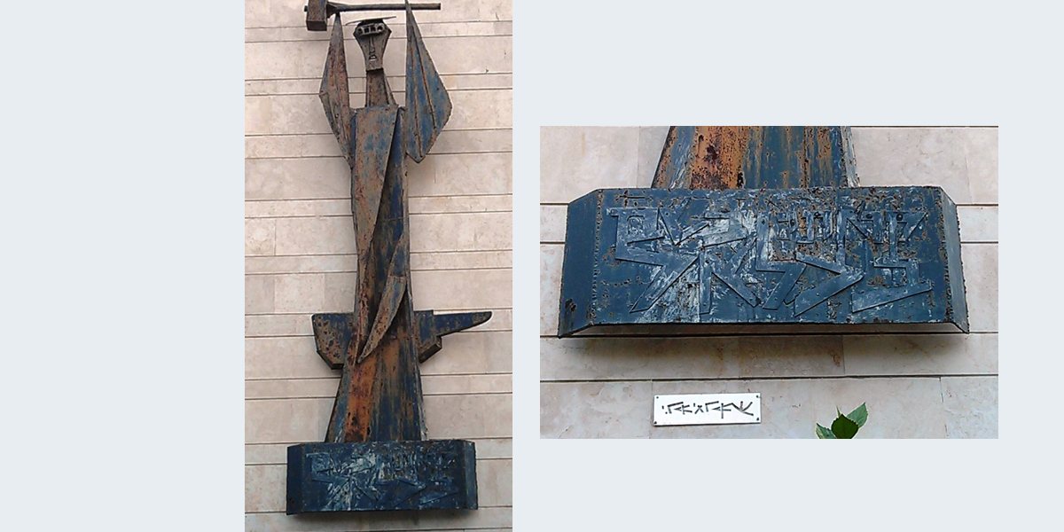 הפסל נמצא על קיר צדדי של מרכז פסג"ה. האמן בצלאל בן־אורי מניף את שתי ידיו כשהוא אוחז פטיש.