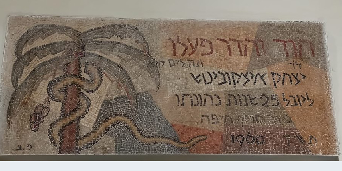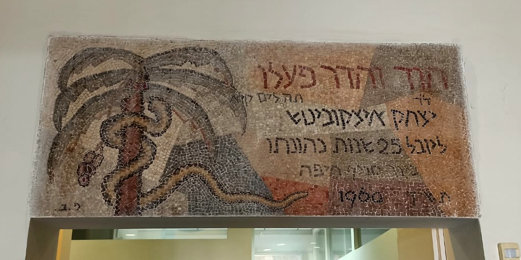 בין היוזמים את הקמת בית הרופא (1949) היה הרדיולוג ד"ר יצחק איצקוביטש, שעמד שנים רבות בראש הסניף החיפני של הסתדרות הרופאים. במלאת 25 שנה לכהונתו נעשה השלט הזה. בשלט רואים מעין סמל הרפואה: נחש מתפתל ומתלפף על גזע עץ דקל, ובכותרת נכתב "הוֹד וְהָדָר פָּעֳלוֹ" (תהלים קיא, ג). לבקשתו של ד"ר איצקוביטש היצירה חתומה רק בראשי התיבות של אמן הפסיפס הירושלמי מרדכי (מוטקה) בלום. בלום נודע בשלטי הפסיפס שעשה במקומות רבים, ובהם כיכר דניה בירושלים, ראו בסקר #2023.