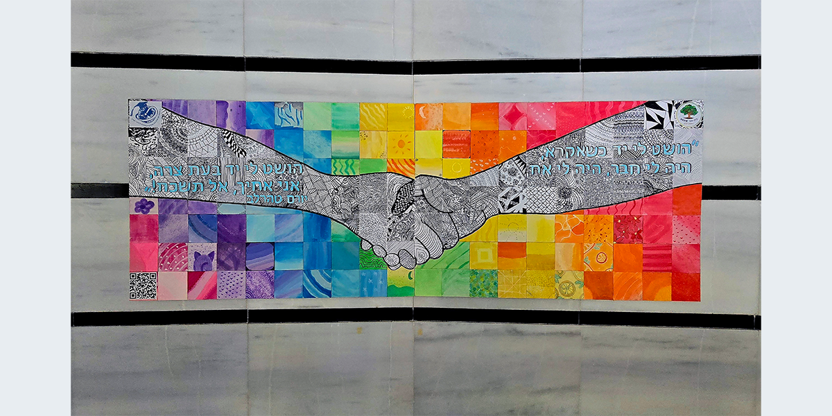 הרקע מסביב לידיים נצבע בבצבעי הקשת כדי שיתחבר לנושא התערוכה "צבעים של תקווה", שכן הקשת שנוצרה כאות להבטחה של בורא עולם שלא להביא שוב מבול על העולם, ולפיכך מסמלת תקווה לימים טובים יותר. כדי להעצים את ערך השותפות השתתפו במיזם תלמידים משני בתי ספר שונים ומשכבות גיל שונות, שיצרו יחדיו פאזל של ריבועים, וכאשר הם מחוברים יחדיו הם יוצרים שלם אחד ועוצמתי.