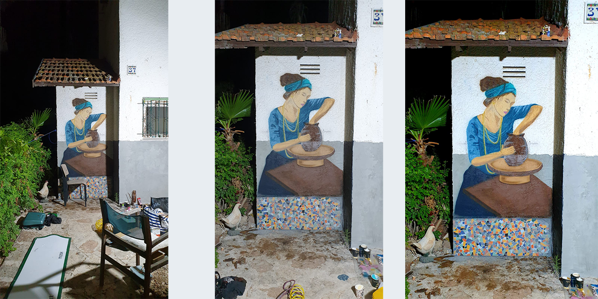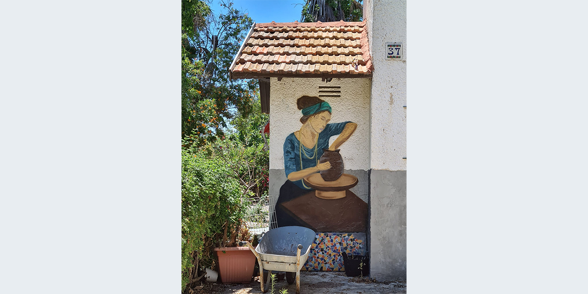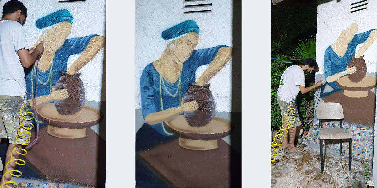 על קיר הסטודיו "כלים לחיים" של האמנית קרן אור דובינסקי צייר האמן איליי חסון את דמותה של האמנית, בשעה שהיא עובדת על האובניים.