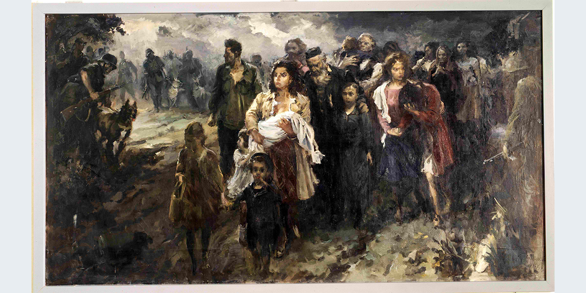האמן יוסף קוזקובסקי, יליד רוסיה (1902–1970), עלה ארצה ב־1969 ונפטר כמה חודשים לאחר עלייתו. הציור נרכש מאלמנתו בשנת 1971. בתמונה נראים יהודים המגורשים ליער, שם עומדים להוציאם להורג. בציור שילב את דיוקנו בדמות חייל יהודי מהצבא האדום שנמלט מהשבי, בא לבקר את משפחתו ומגורש איתם. הוא נמצא בשולי הקבוצה ומסתכל ימינה.
