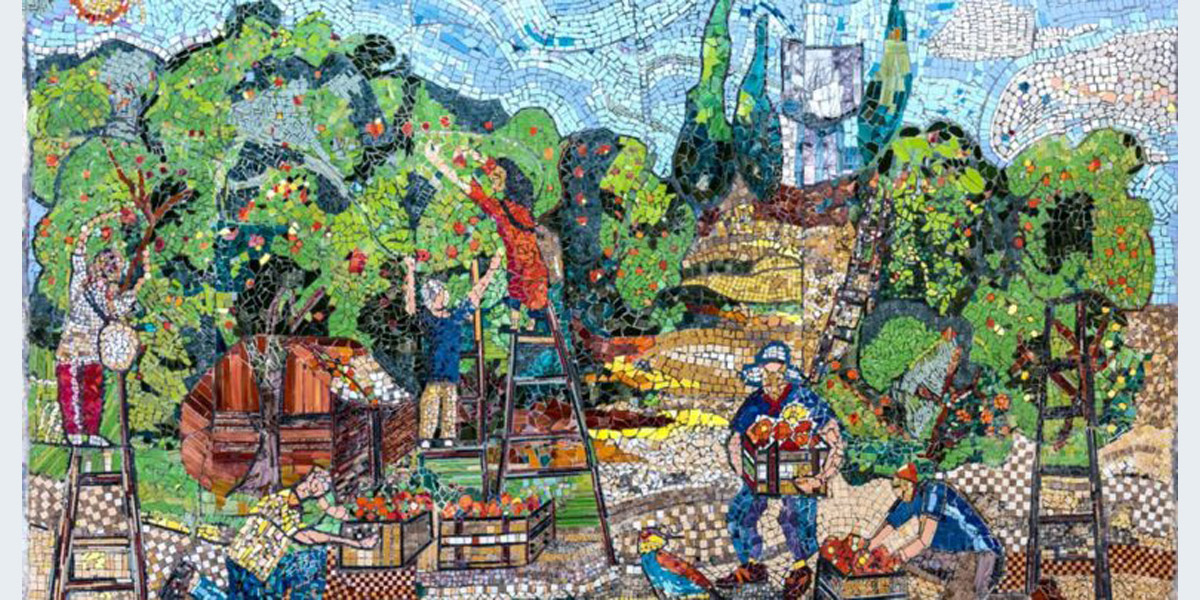 הוגת הרעיון של הפסיפס הייתה רותי השמשוני, ייעצה נוגה ספקטור והנחתה ציפי קליינר, היא גם ציירה את ציור הפסיפס ושילבה בו יסודות שהמתנדבים הציעו על סמך זיכרונותיהם מן הפרדס. הפסיפס עשוי אבנים טבעיות.