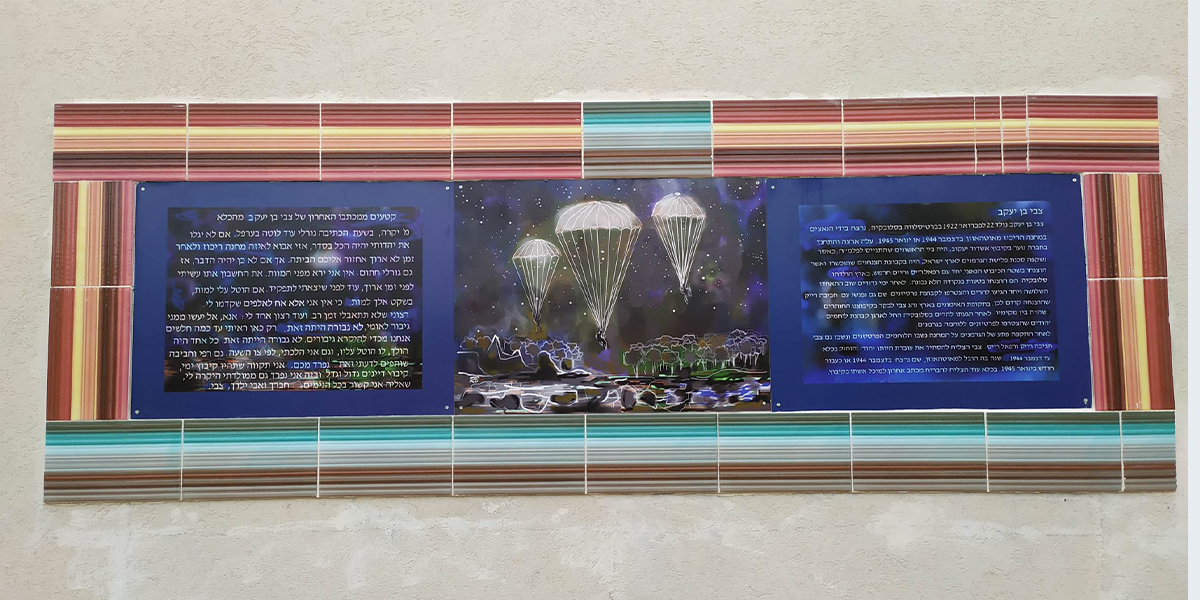 לוח הנצחה לצנחן צבי בן־יעקב שנקבע על הקיר החיצוני של הארכיון במבנה ע"ש צבי בן יעקוב.