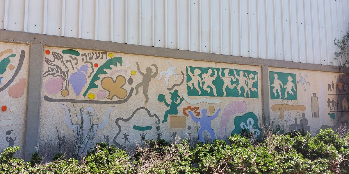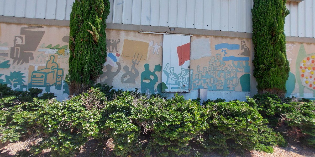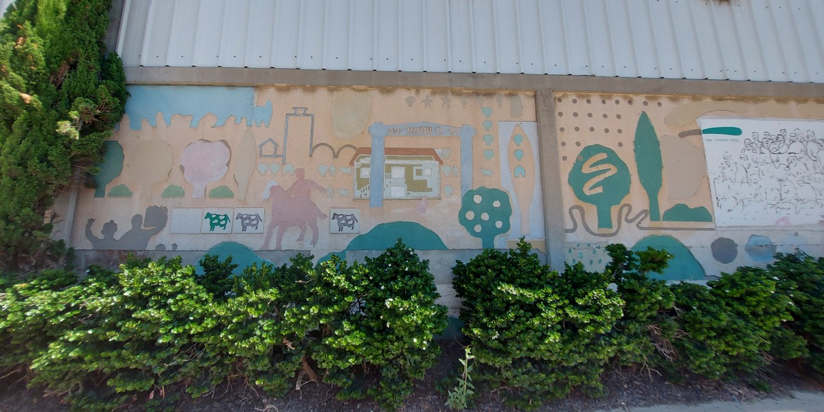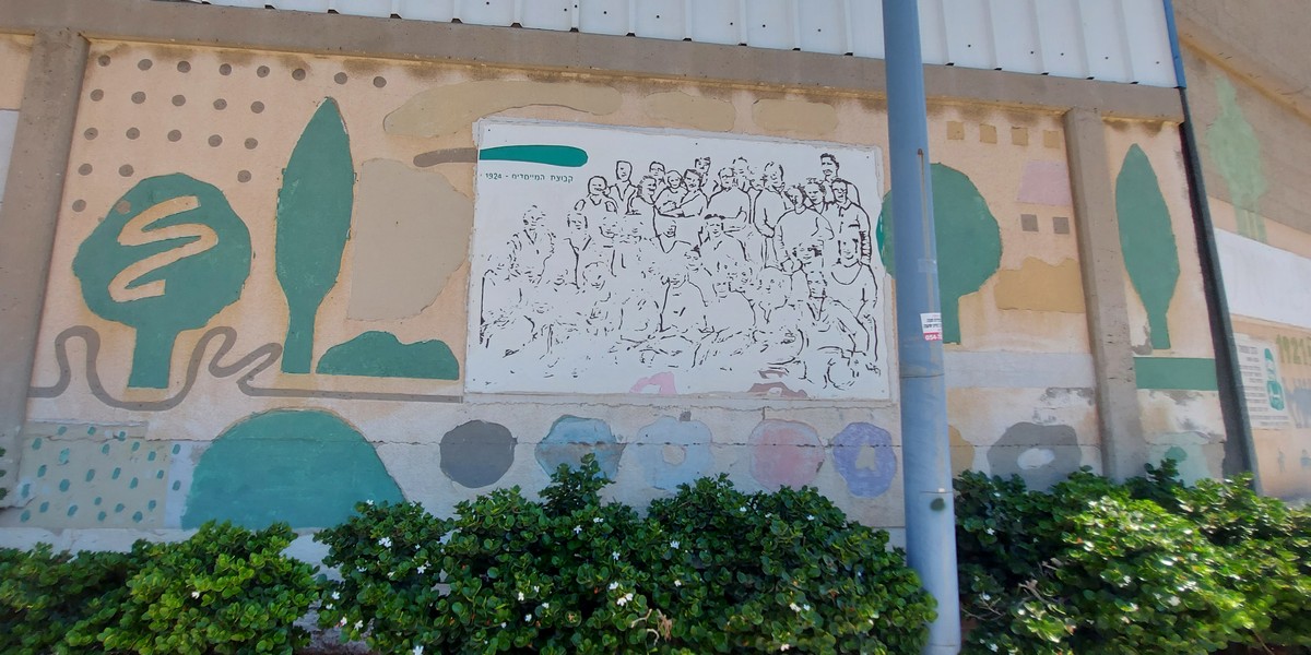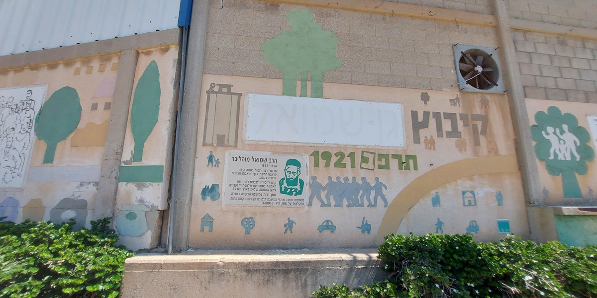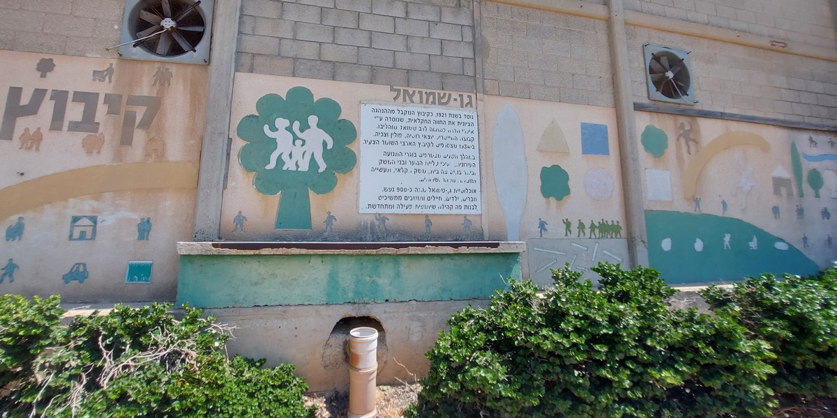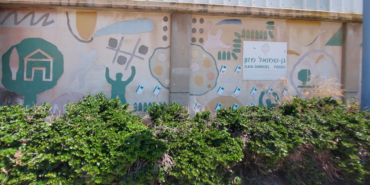הציור שעל קיר המפעל גן שמואל מזון (גניר) לאורך כביש הכניסה לקיבוץ, מתאר את חיי החברים בקיבוץ.