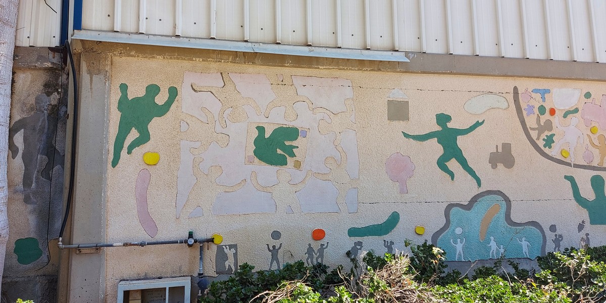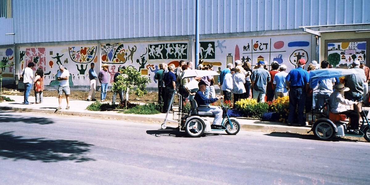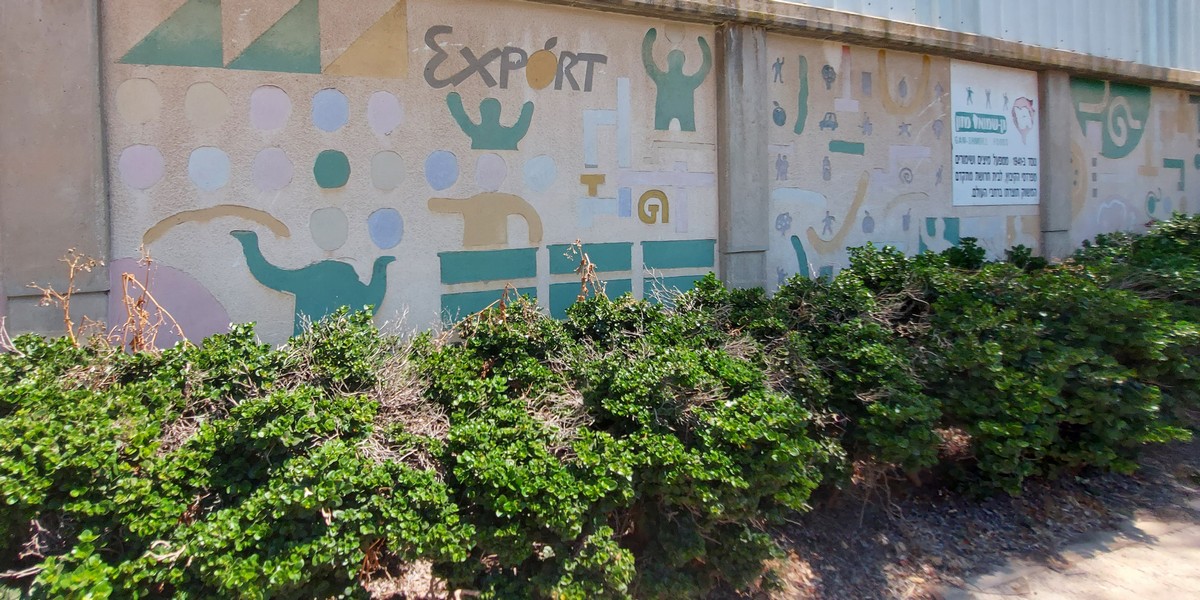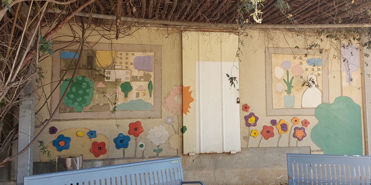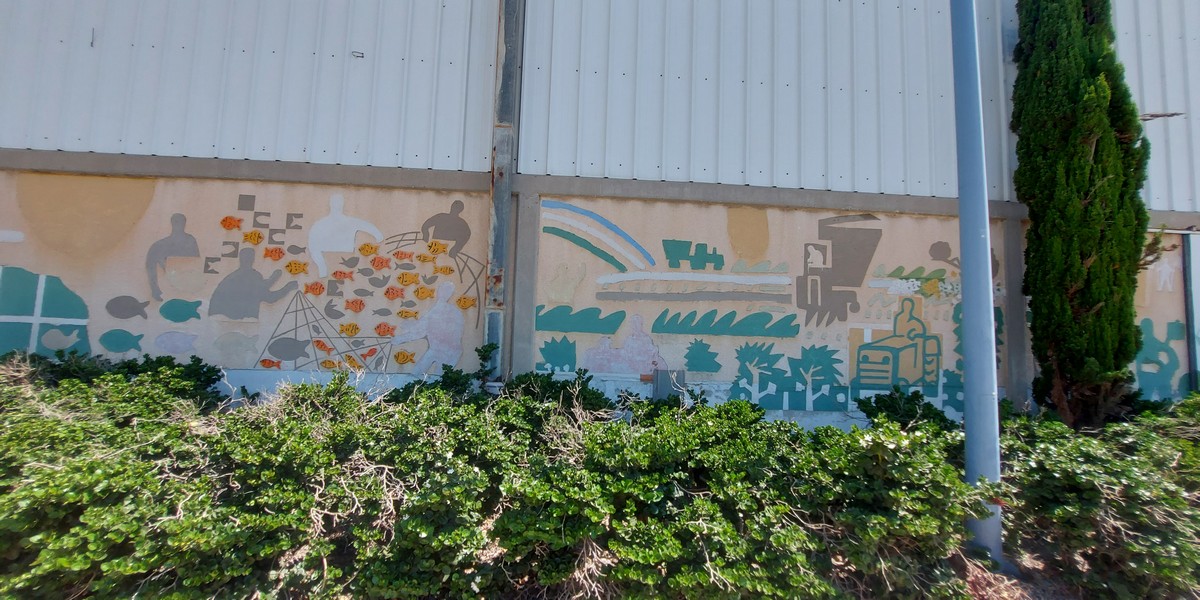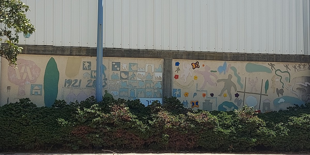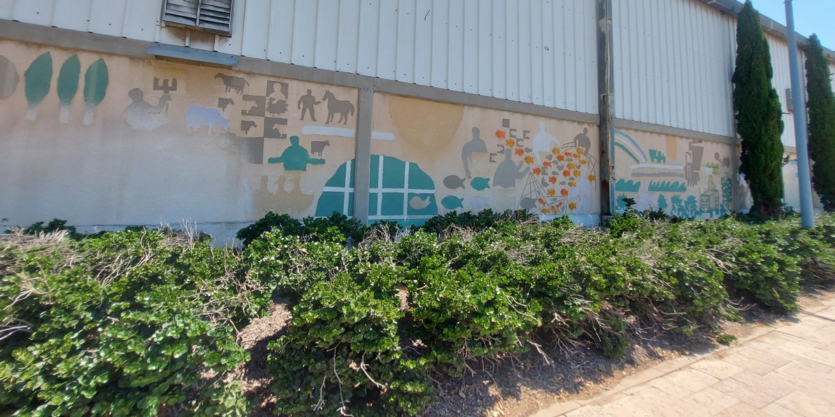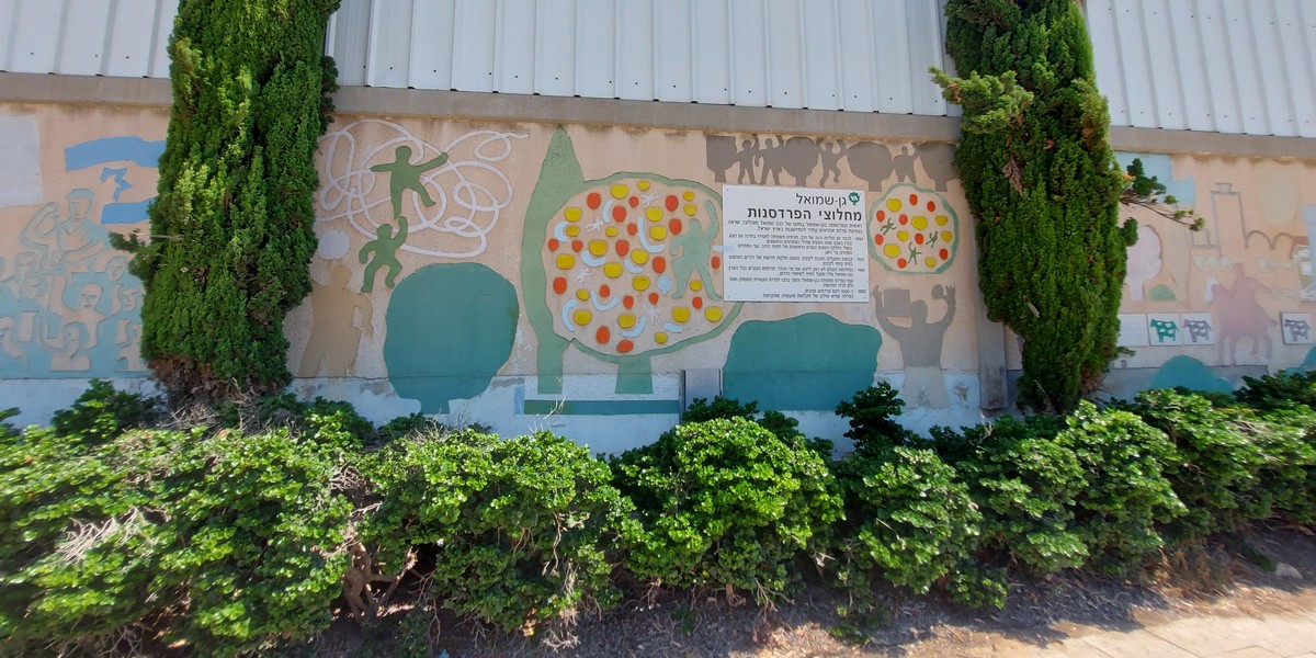 הציור שעל קיר המפעל גן שמואל מזון (גניר) לאורך כביש הכניסה לקיבוץ, מתאר את חיי החברים בקיבוץ.