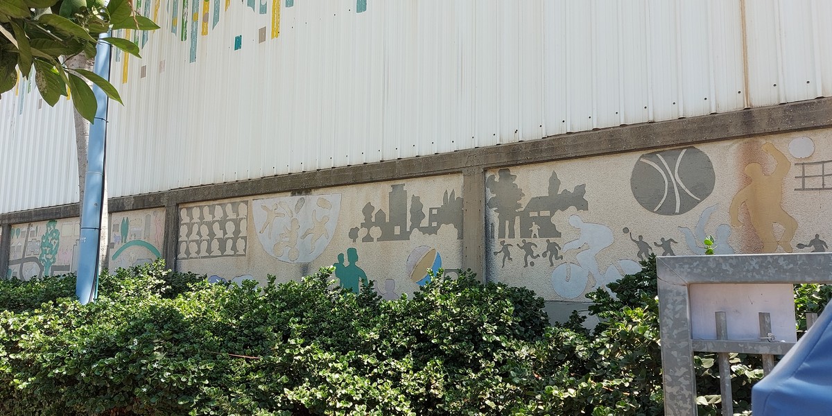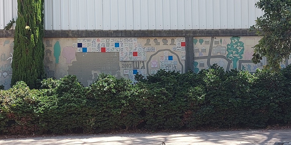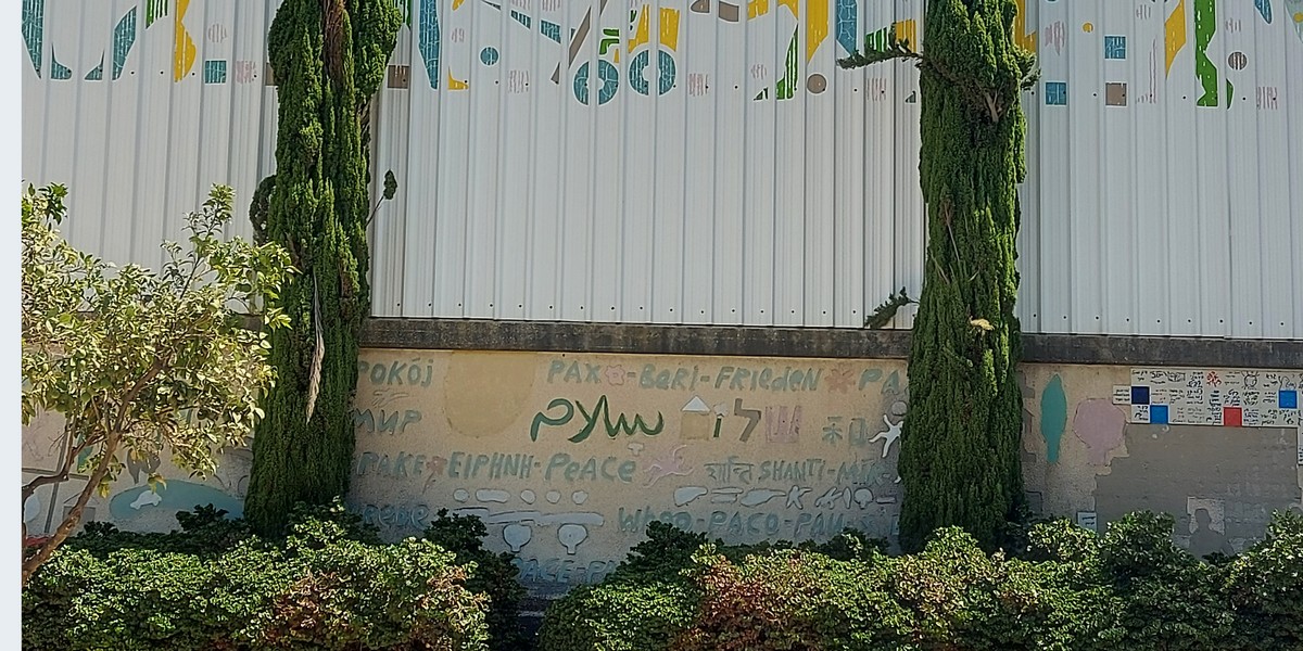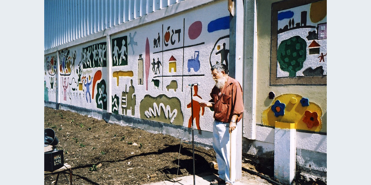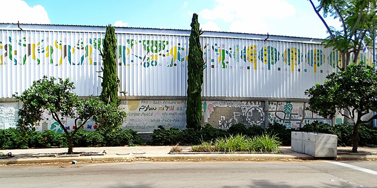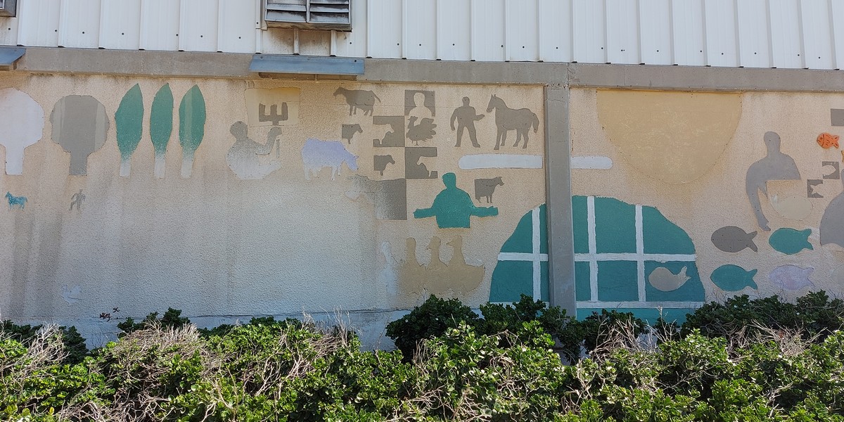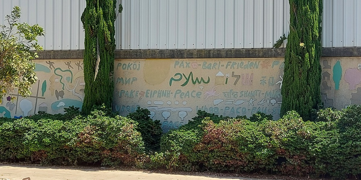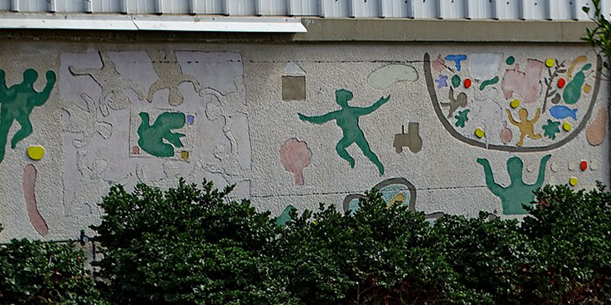 הציור שעל קיר המפעל גן שמואל מזון (גניר) לאורך כביש הכניסה לקיבוץ, מתאר את חיי החברים בקיבוץ.
