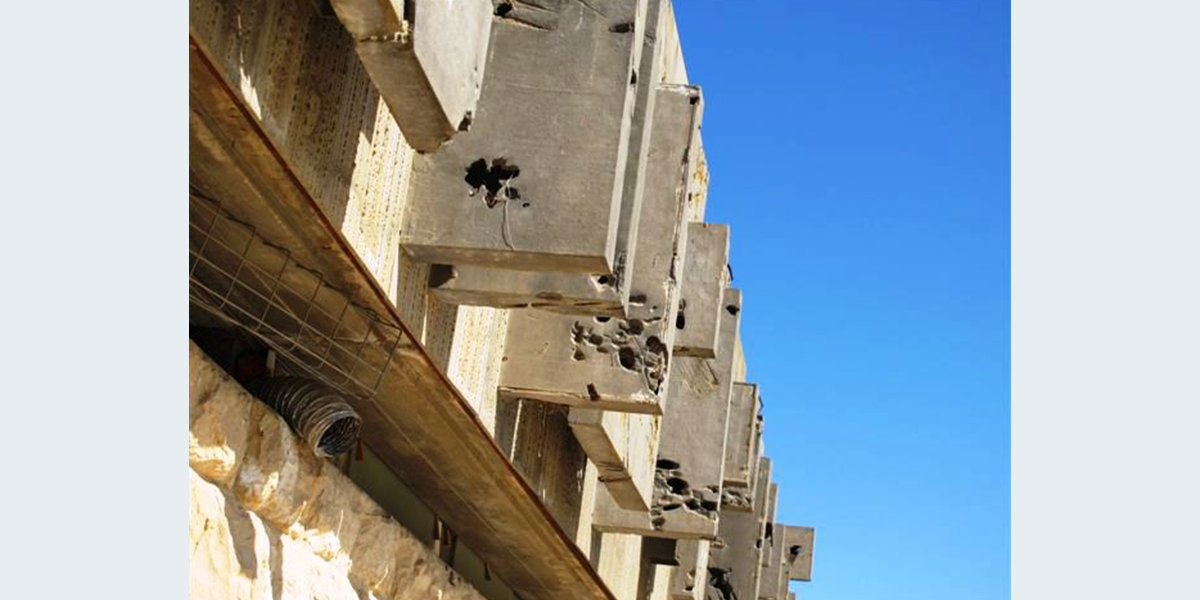 השימוש בשני אלמנטים בסיסיים העניק לתבליט אחידות ויזואלית ויצר סדרתיות בין כל האותיות שמרכיבות את הפסוק. אותיות האלומיניום שקובעו אל הקיר אינן בעלות מרקם חלק. ריזינגר יצר בהן בכוונה שריטות ופגמים, הוא חורר אותן וחבט בהן. 'רציתי ליצור אפקט של חורבן והרס, של פגיעה ושל סבל; כזה שייצג את הסבל שעברו היהודים בתקופת השואה', הוא מסביר.