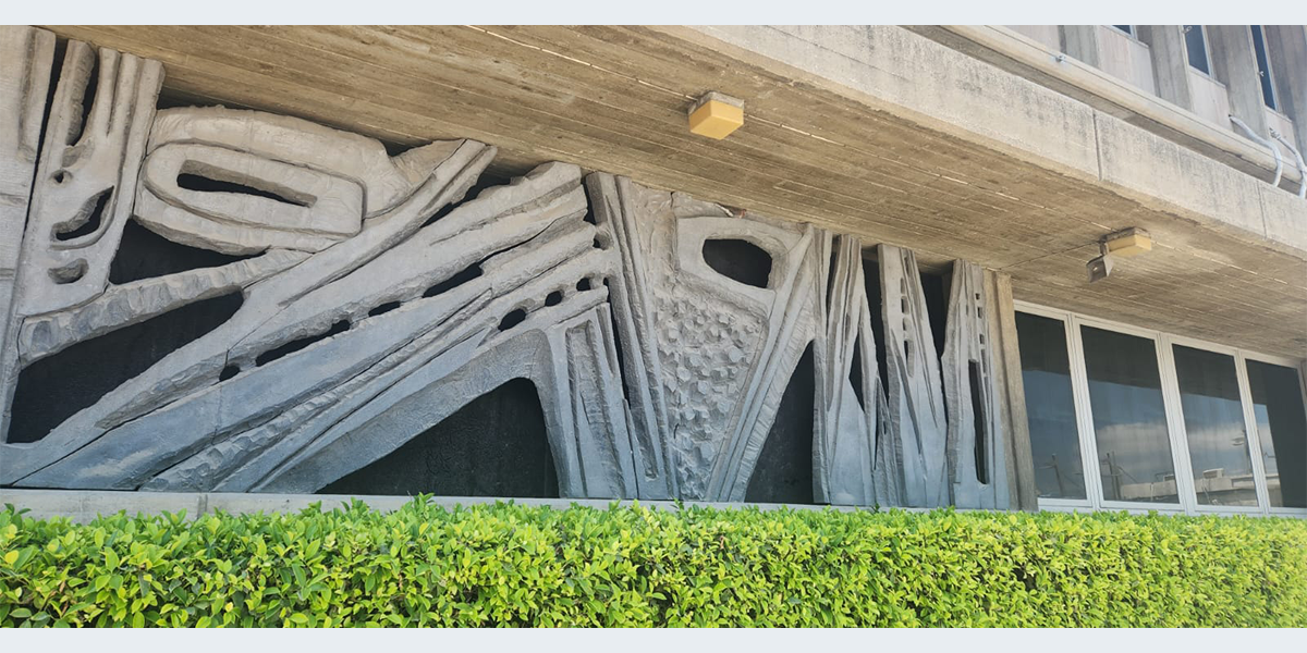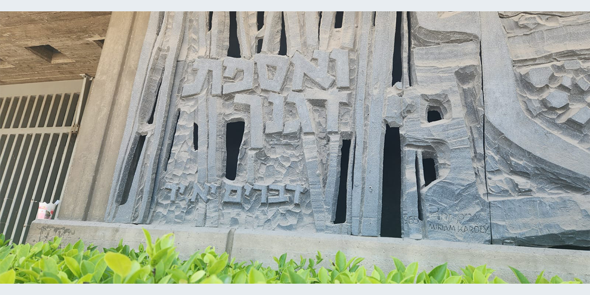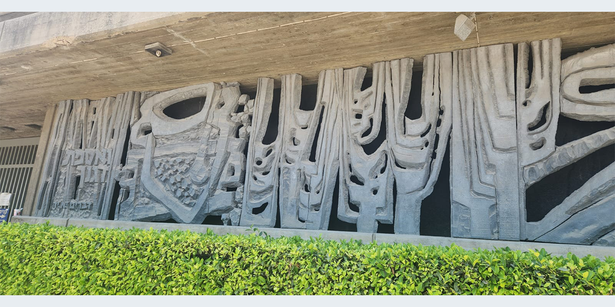 תבליט דמוי־שיבולים הקבוע לצד הכניסה למוזאון דגון וברום החזית המזרחית נראה סמל הממגורות.