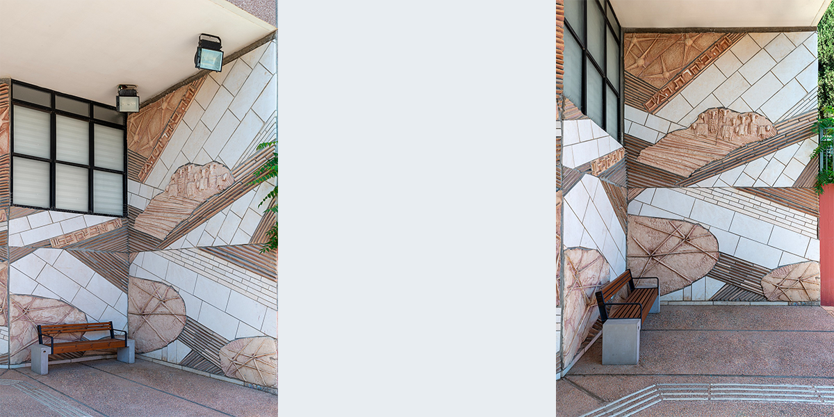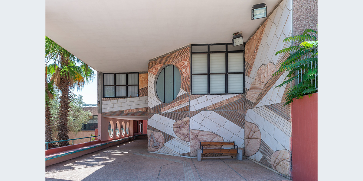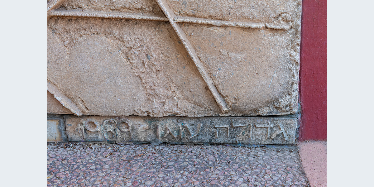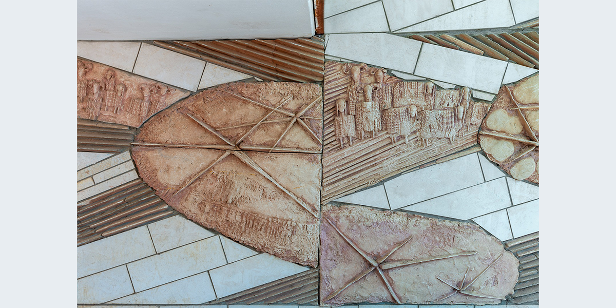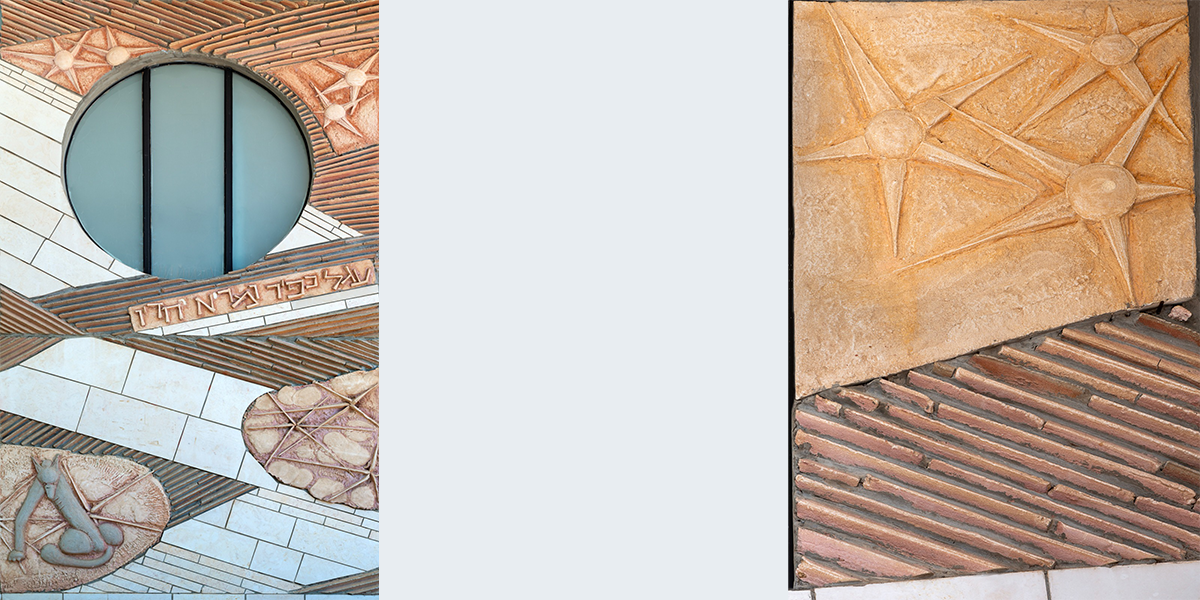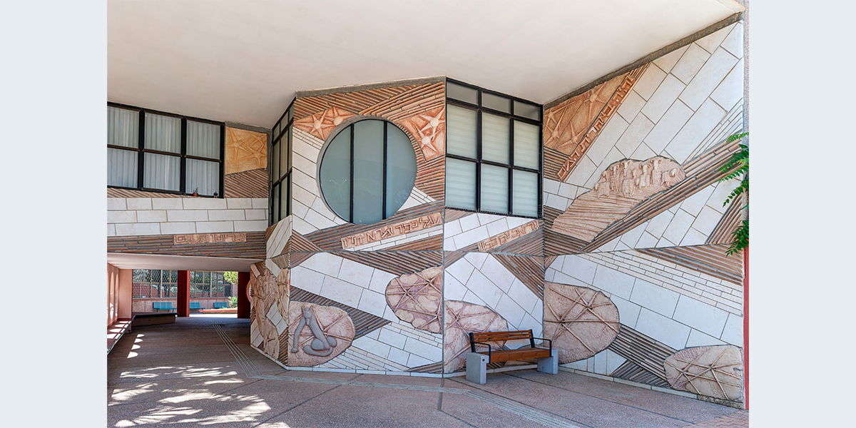 תבליט קיר עשוי מבטון ביציקת חול ולוחות אבן חתוכים. הנושא הוא הפסוק "והיה באחרית הימים וגר זאב עם כבש, עגל כפיר ומריא יחדיו ונער קטון נוהג בם" הפסוק זורם לאורך התבליט, המילים האחרונות מופיעות מעל הכניסה לבית הספר. הקיר מעוצב בתנועה שמספרת על תהפוכות הזמנים לקראת אחרית הימים.