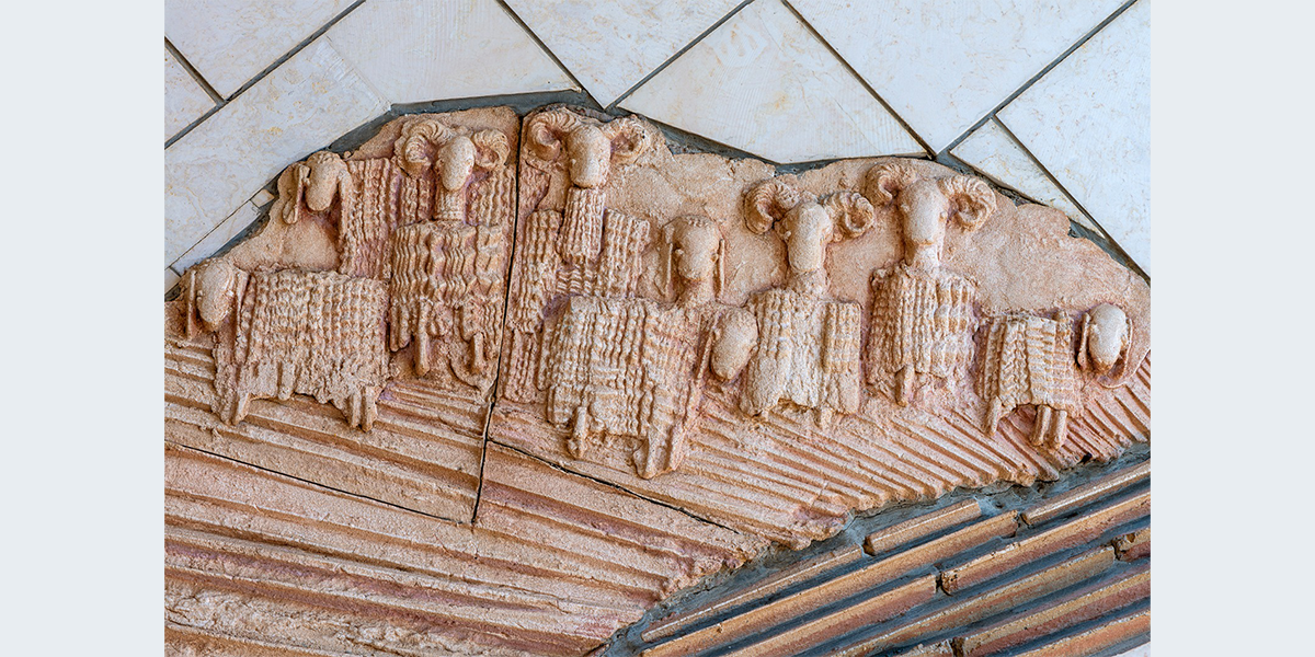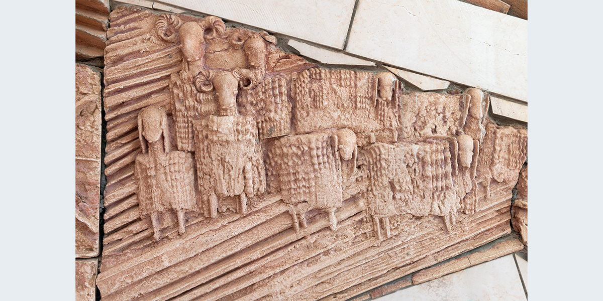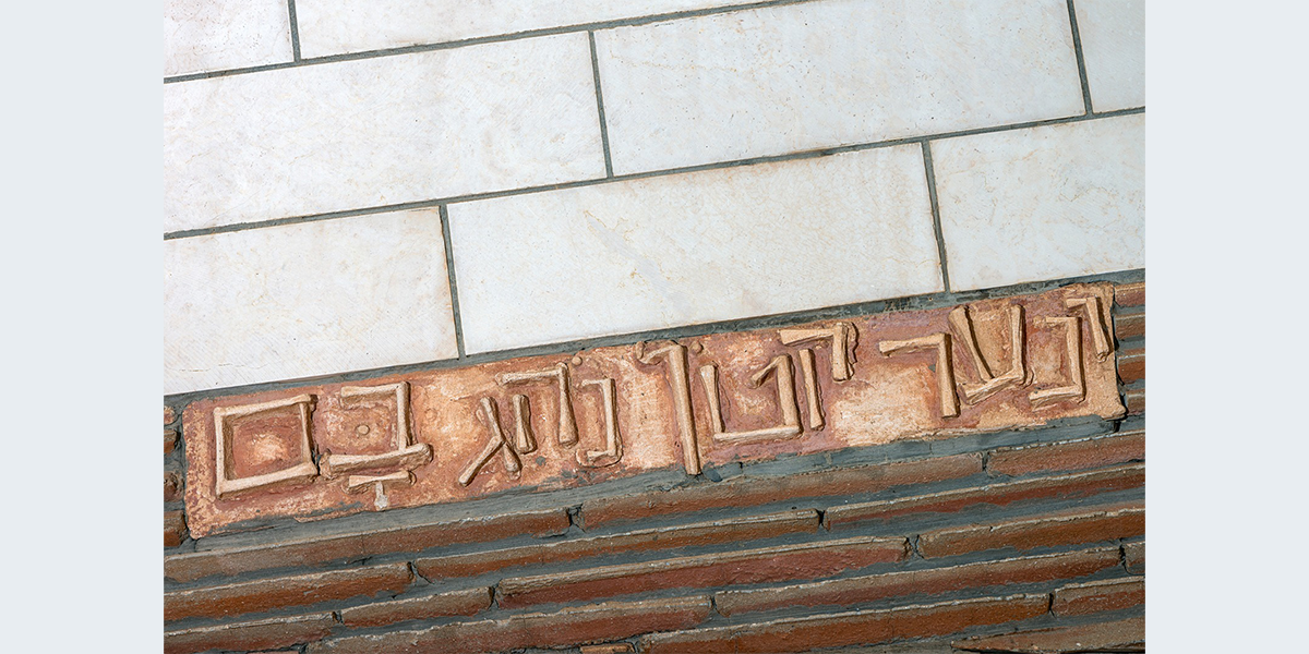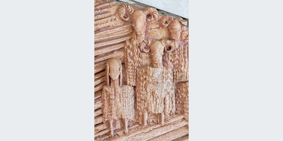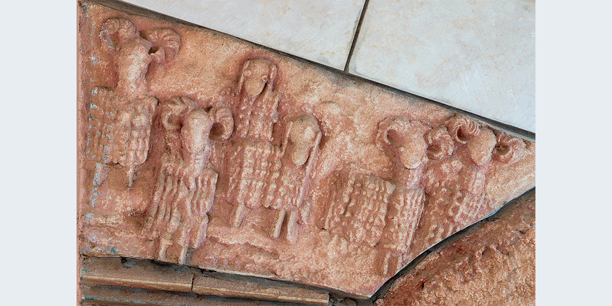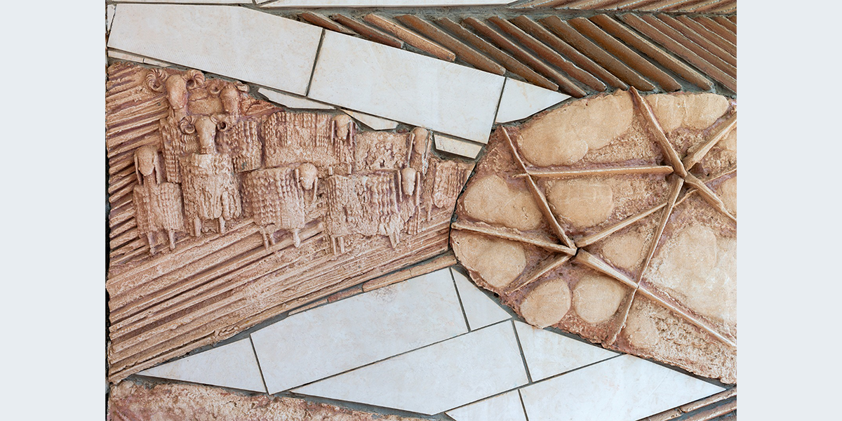 תבליט קיר עשוי מבטון ביציקת חול ולוחות אבן חתוכים. הנושא הוא הפסוק "והיה באחרית הימים וגר זאב עם כבש, עגל כפיר ומריא יחדיו ונער קטון נוהג בם" הפסוק זורם לאורך התבליט, המילים האחרונות מופיעות מעל הכניסה לבית הספר. הקיר מעוצב בתנועה שמספרת על תהפוכות הזמנים לקראת אחרית הימים.