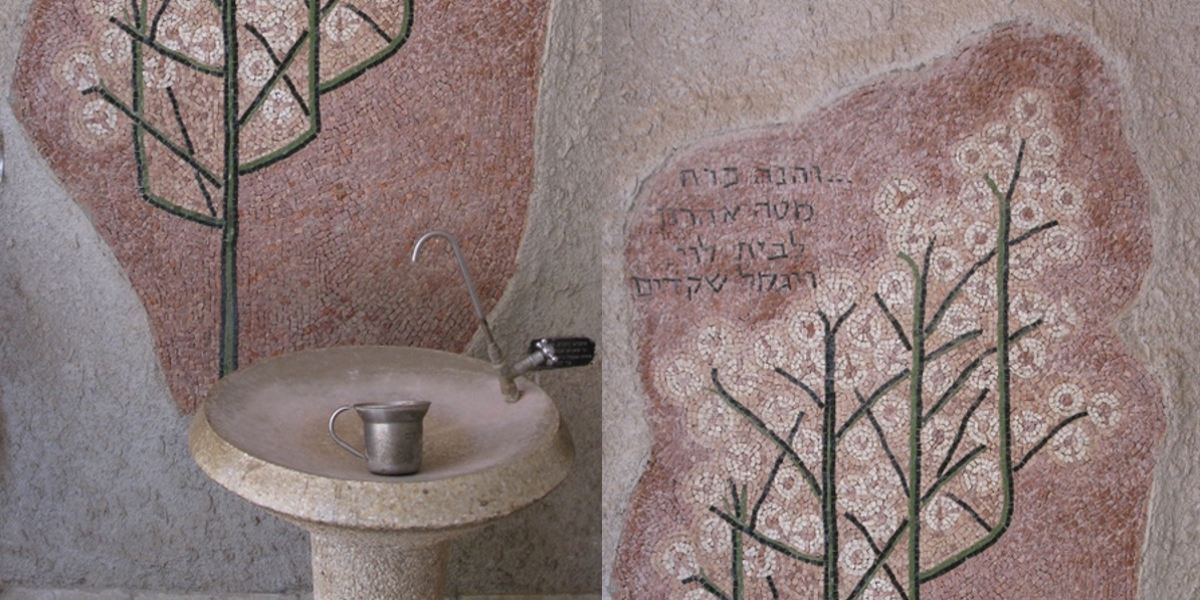 פסיפס המראה ענף שקדייה פורח ובצידו הפסוק: "וְהִנֵּה פָּרַח מַטֵּה אַהֲרֹן… וַיִּגְמֹל שְׁקֵדִים", במדבר יז, כג. הפסיפס שנמצא על הקיר בחצר בית הכנסת ליד הכיור שבו נוטלים הלוויים ידיים לכוהנים לפני ברכת כוהנים, נתרם על ידי משפחה מלביא וכתוב לידו: "מוקדש לזכרם של הורינו ר' חזקיהו אברהם הלוי ורעיתו שענדל בת יששכר דוב הלוי, ע"י ילדיהם".