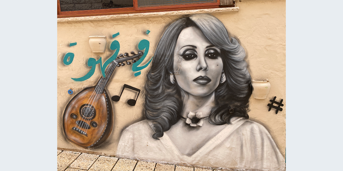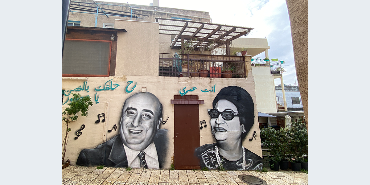 הצייר בנצי ברופמן צייר את הדיוקנאות על חזית בית קפה וחנות כלי מוזיקה.