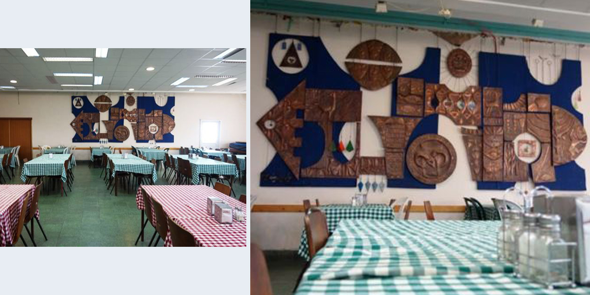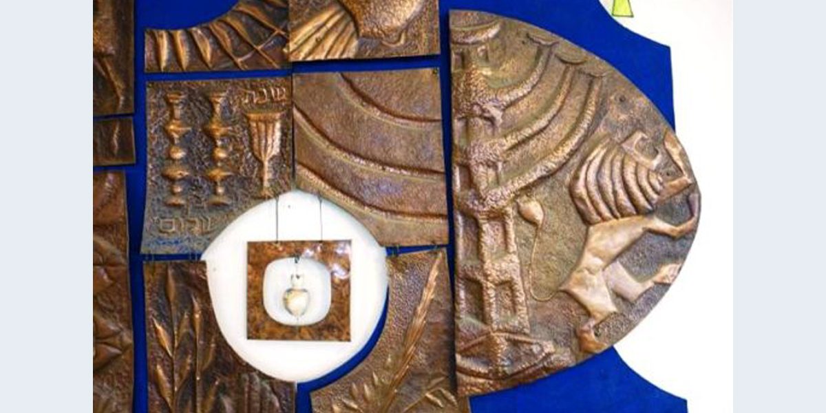 ריקועי נחושת שקישטו את חדר האוכל לקראת החגים, ובהם סמלים כגון פמוטות, מנורה, איל וחנוכייה.