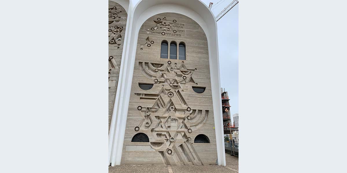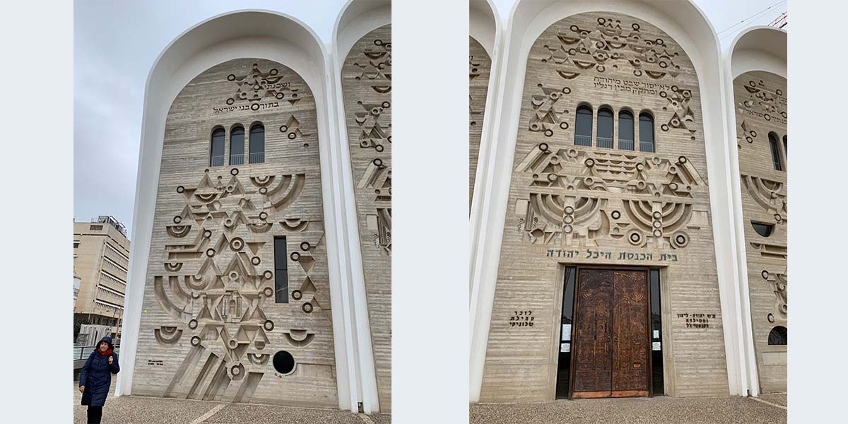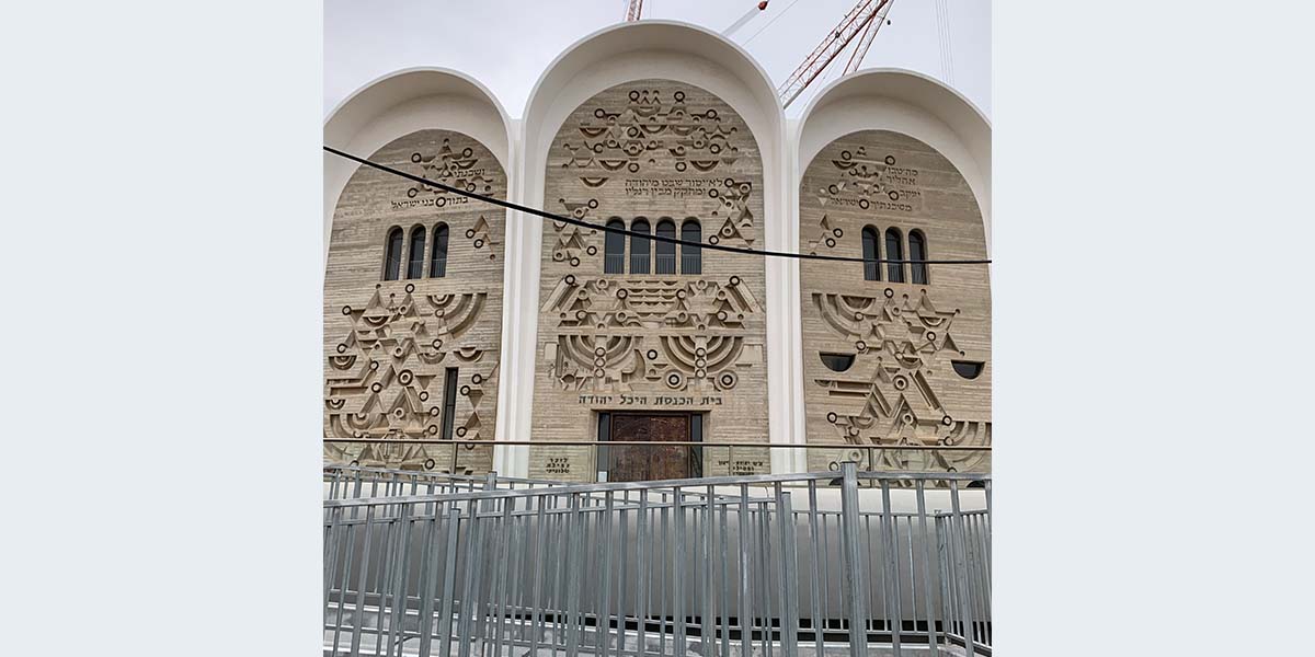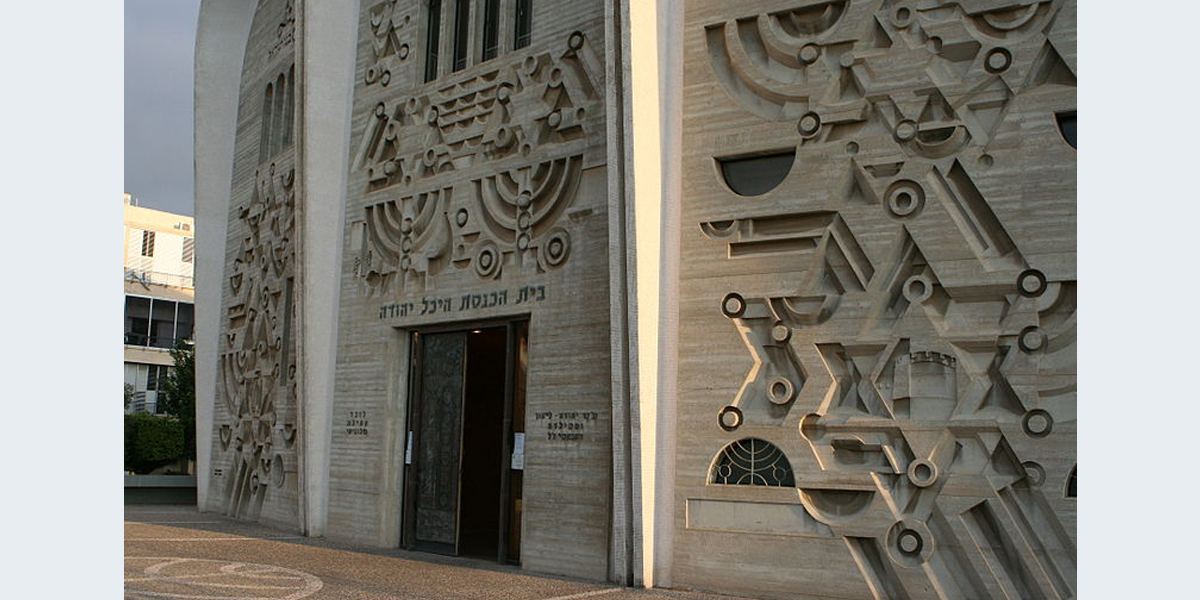 תבליטי בטון על חזית בית הכנסת "היכל יהודה" שצורתה – שלוש קשתות. בחזית משוקעים מגיני דוד, מנורות ופסוקים מן המקורות, ובהם: "ושכנתי בתוך בני ישראל" (שמות כט, מה), "לא יסור שבט מיהודה ומחוקק מבין רגליו" (בראשית מט, י) ו"מה טובו אוהליך יעקב משכנותיך ישראל" (במדבר כד, ה).