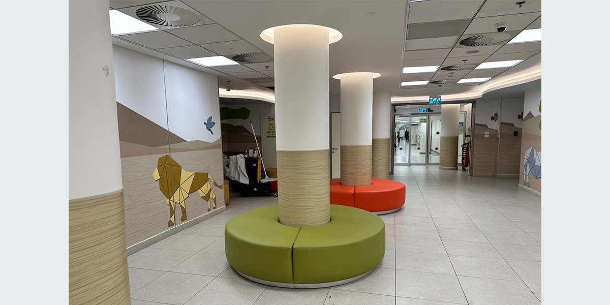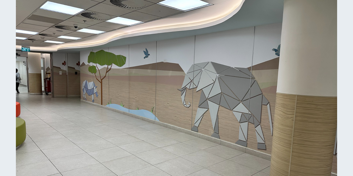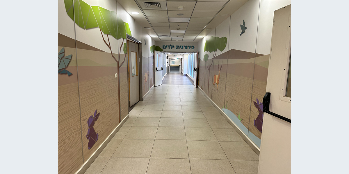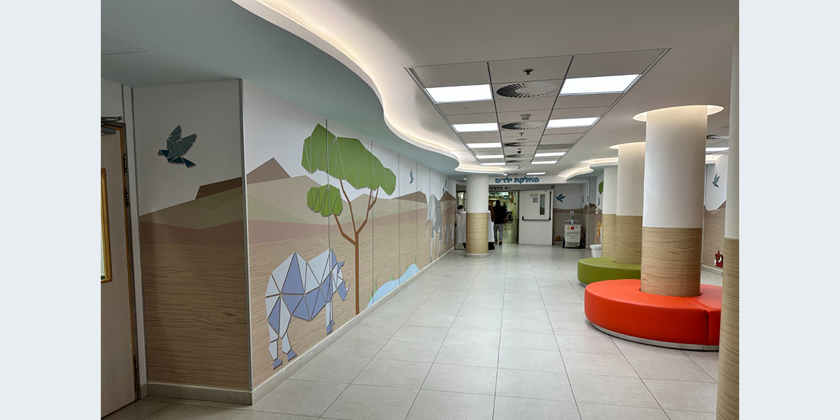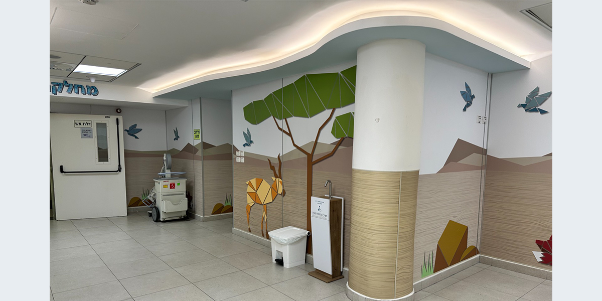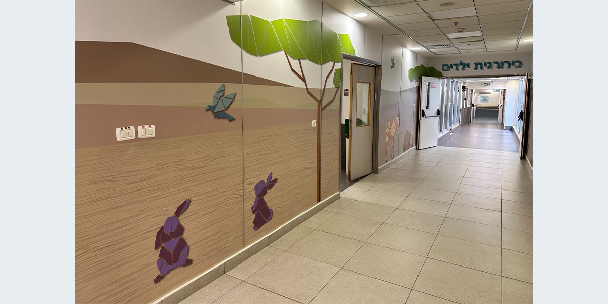 בהשראת חזית הכניסה למיון ילדים בבית החולים, שעיצבה האדריכלית פאתן קטוף, ועליה יצרה חיות עשוית כאוריגמי מפח מקופל, קושטו קירות מחלקת הילדים גם בדמויות של בעלי חיים המעוצבים כקיפולי נייר. התוכנית הייתה ליצור אותם בעץ, אבל בשל בעיות תקציב הודפסו הדמויות הללו על חומר קשיח (IPC) המגן על הקירות. ראו #7232