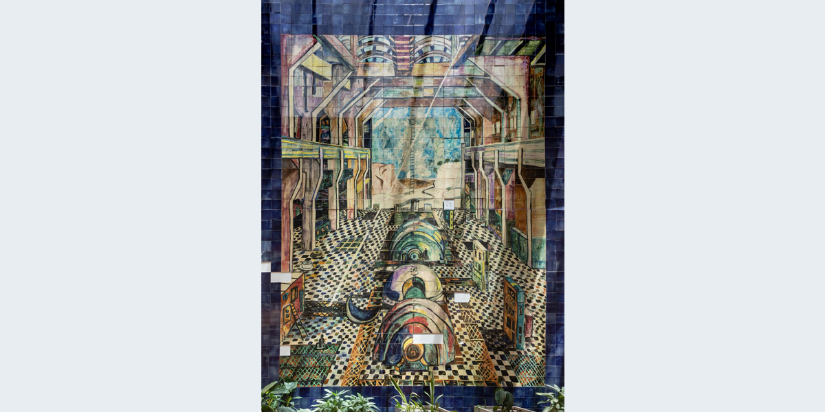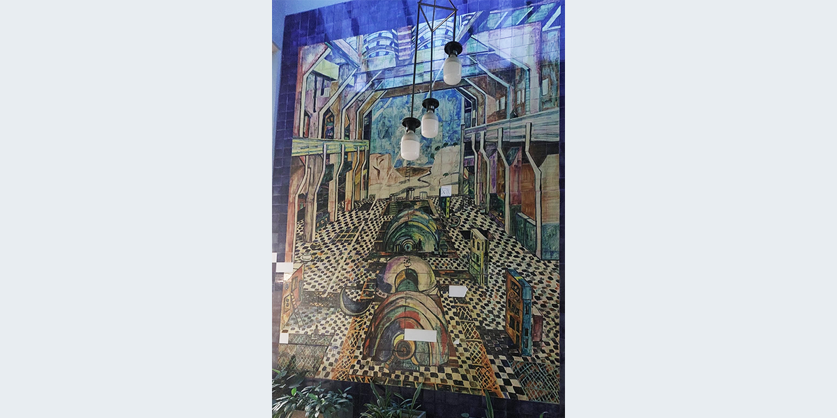 תיאור חלל אולם הייצור הגדול בתחנת הכוח ההיסטורית רדינג א בתל אביב־יפו. את הציור צייר מיכאל קובנר, וביצוע העבודה על האריחים הופקד בידי ארמן דריאן.