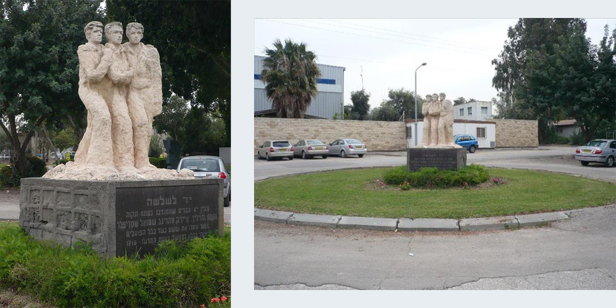 בשנת 1916 בעת מלחמת העולם הראשונה חשדו השלטונות הטורקים שבארץ פועלים מרגלים למען הבריטים. בחיפושיהם הגיעו לפתח תקווה ותבעו להסגיר לידיהם 42 משומרי המושבה באשמת ריגול. לאחר לבטים הוסגרו לידיהם 11 פועלים בעלי נתינות אוסטרית, בהנחה שהודות לנתינות הם לא ייפגעו. אך 11 הפועלים הועברו לכלא בדמשק, שם מתו שלושה מהם בעינויים. על שם שלושת הנרצחים נקרא קיבוץ גבעת השלושה. לאחר הפילוג בקיבוץ המאוחד ב־1952 הקימו חברים שפרשו מגבעת השלושה את קיבוץ עינת, וכעבור כמה שנים הוקמה האנדרטה בקיבוץ לזכר השלושה.