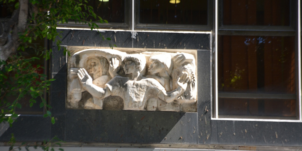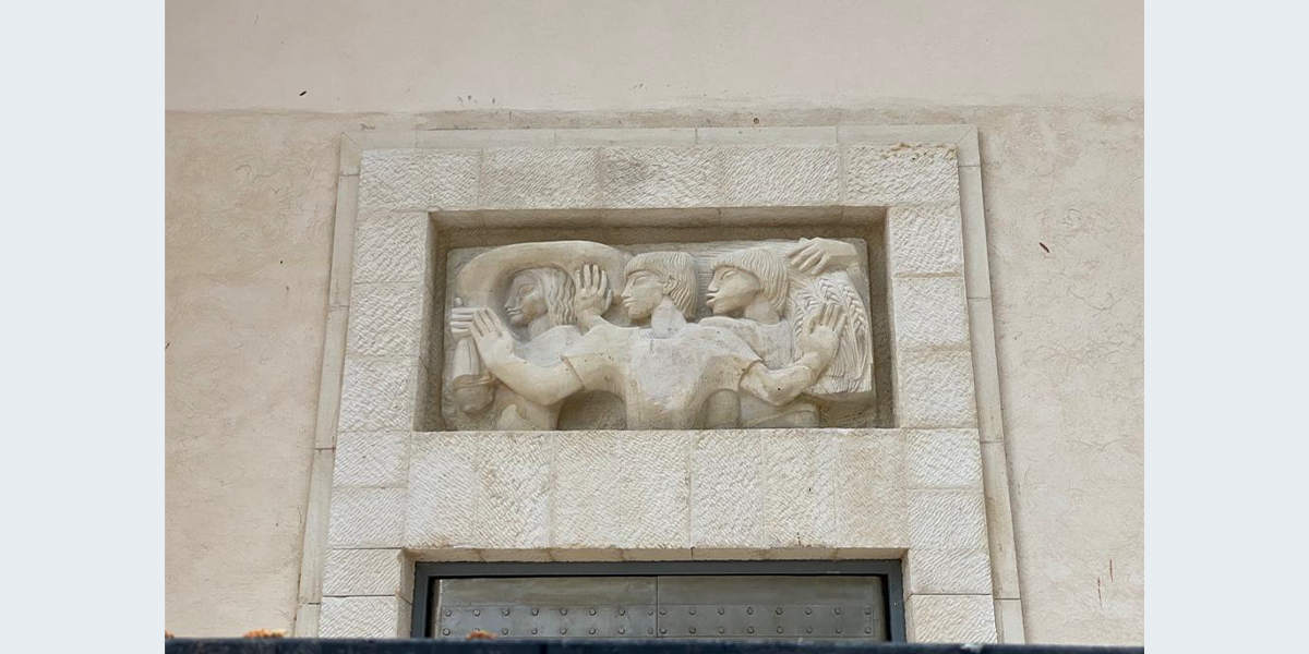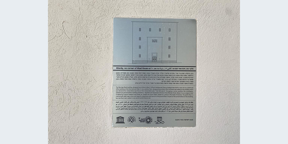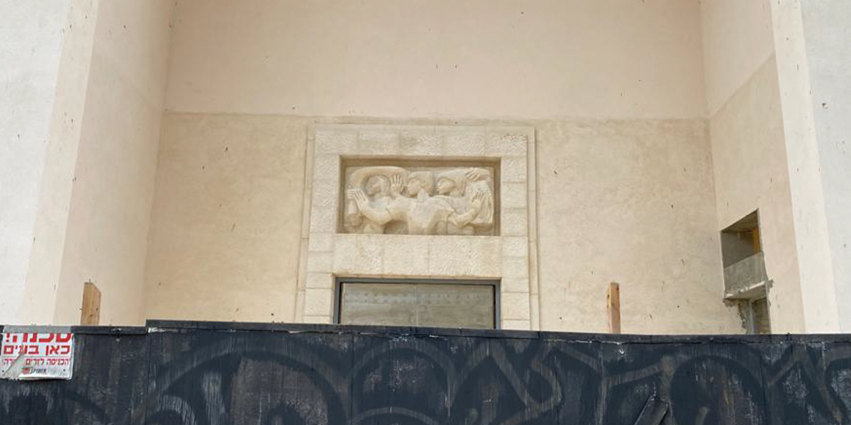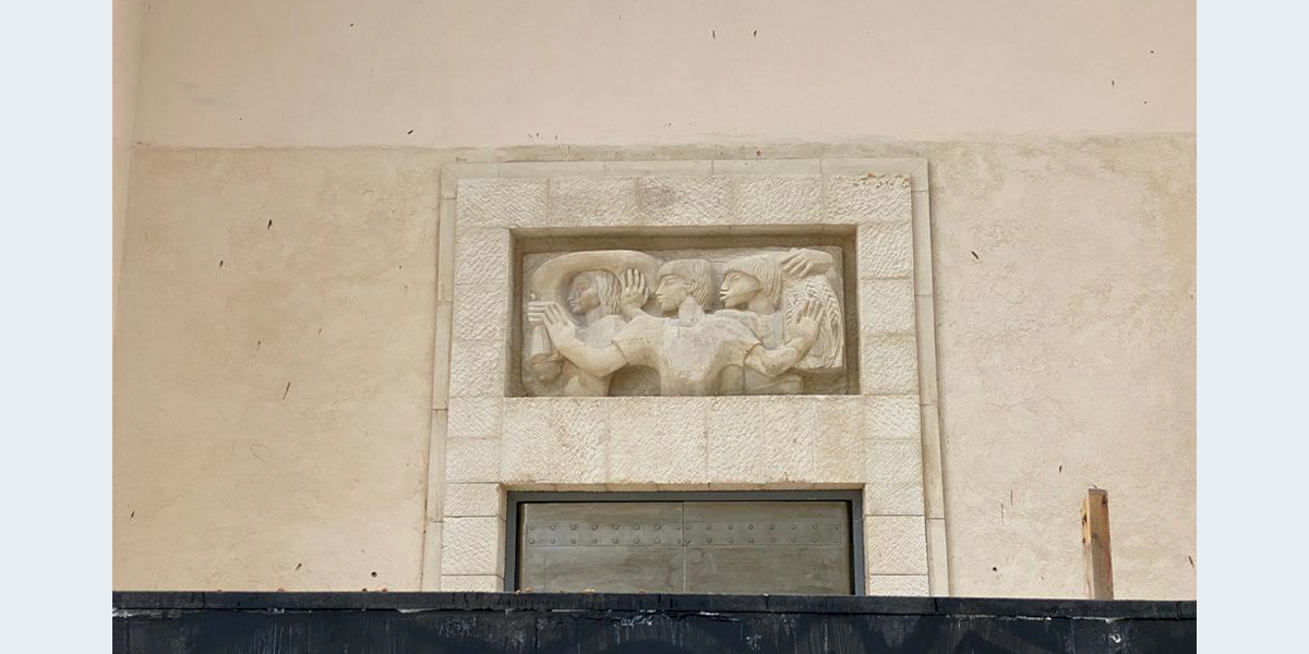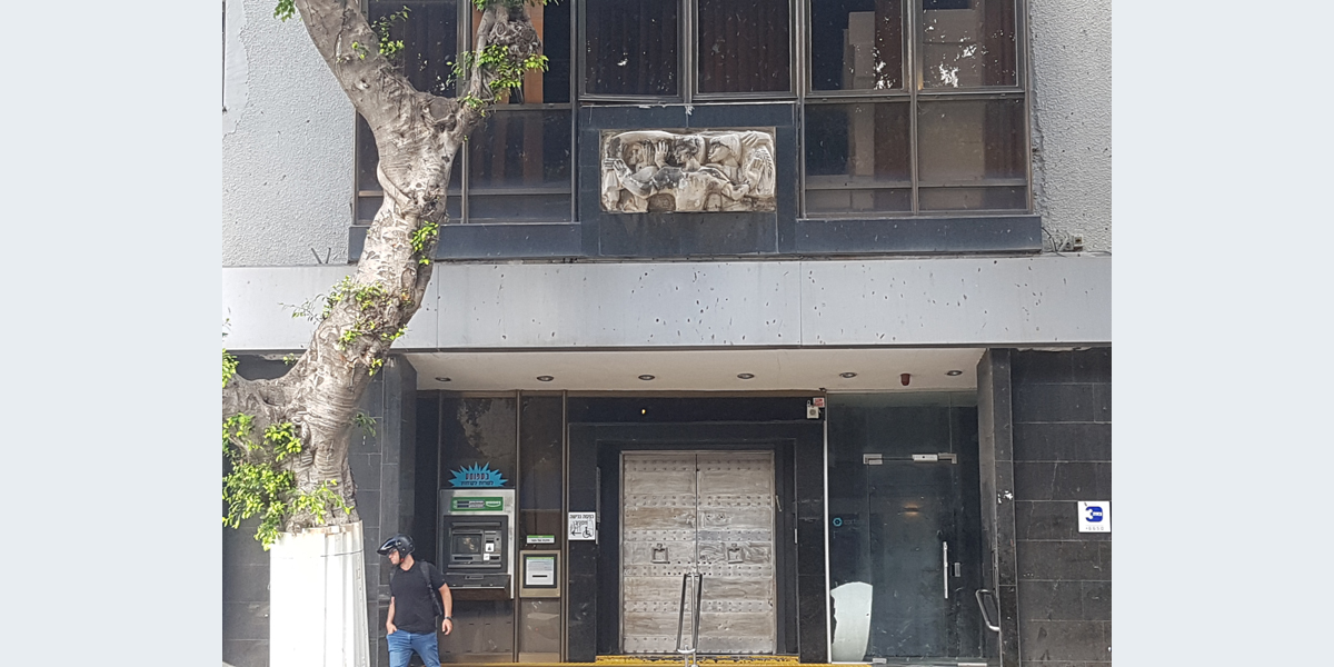 הדמות המרכזית בתבליט מניפה ידיים ופונה הצידה כמו באמנות המצרית, ומאחוריה נראות עוד דמויות. את התבליט יצרה ככל הנראה פרנסס ברוס האברד, אשת האדריכל הבריטי פירס האברד שתכנן עם האדריכל קליפורד הולידיי מבנים בארץ בתקופת המנדט הבריטי, ובהם בנק ברקליס. יש הטוענים שאת התבליט פיסל הפסל הבריטי אֶריק גיל ששהה בארץ בשנים 1934 ו־1937.