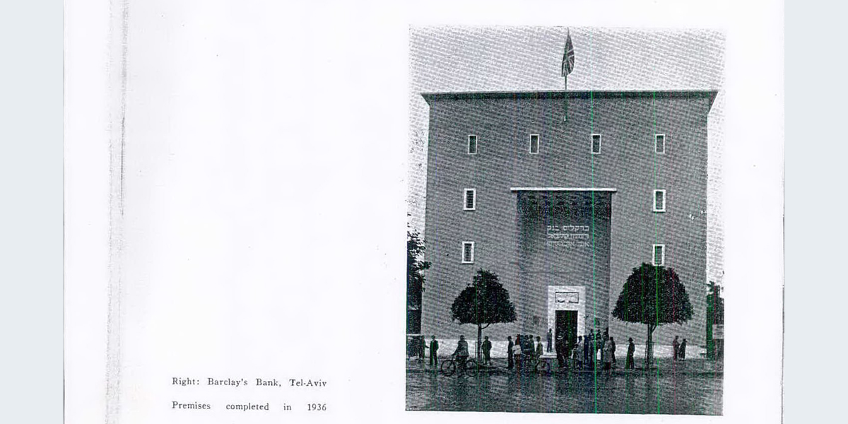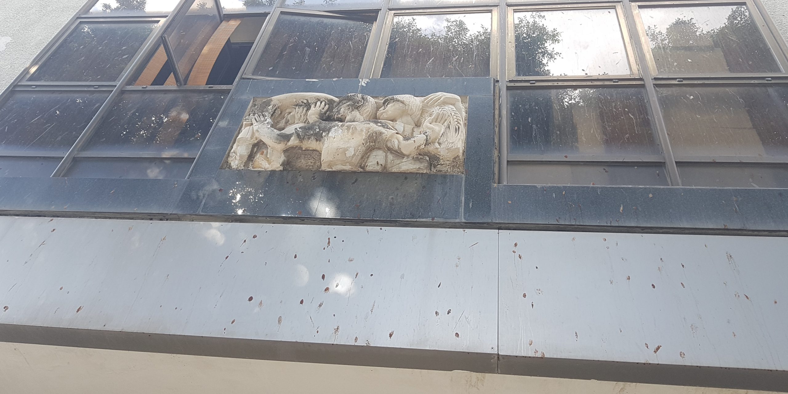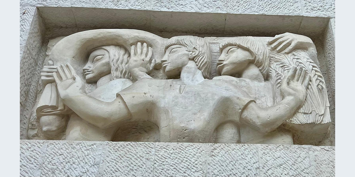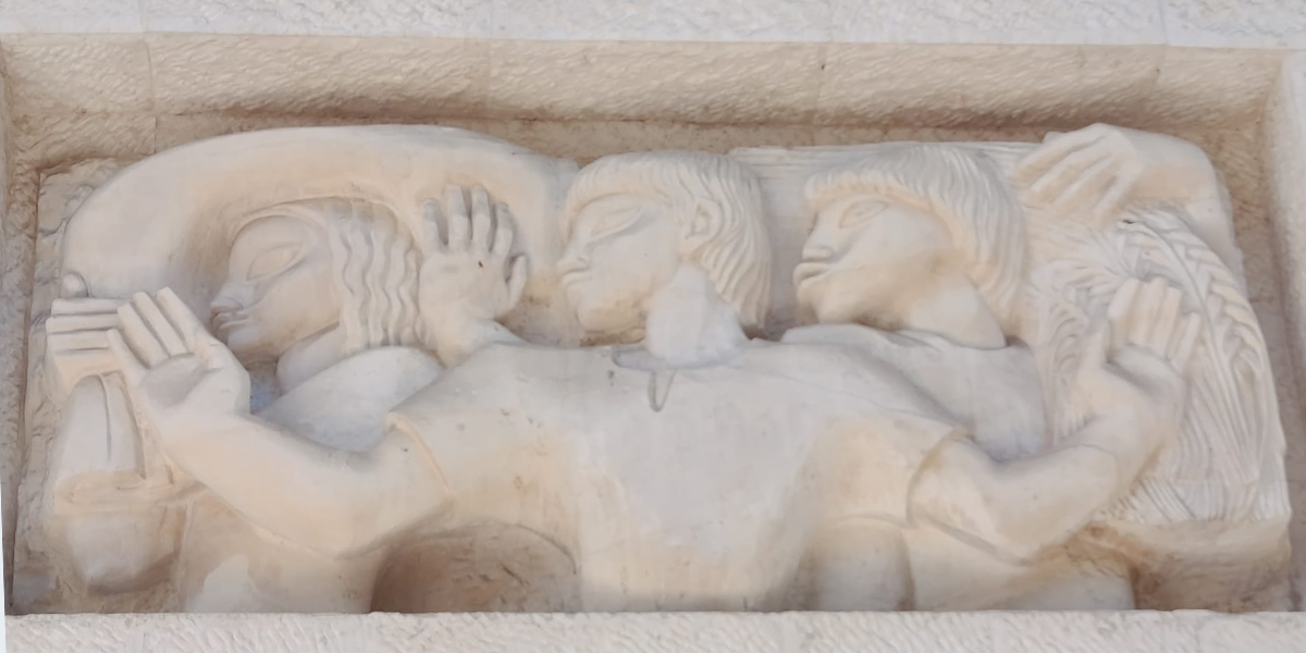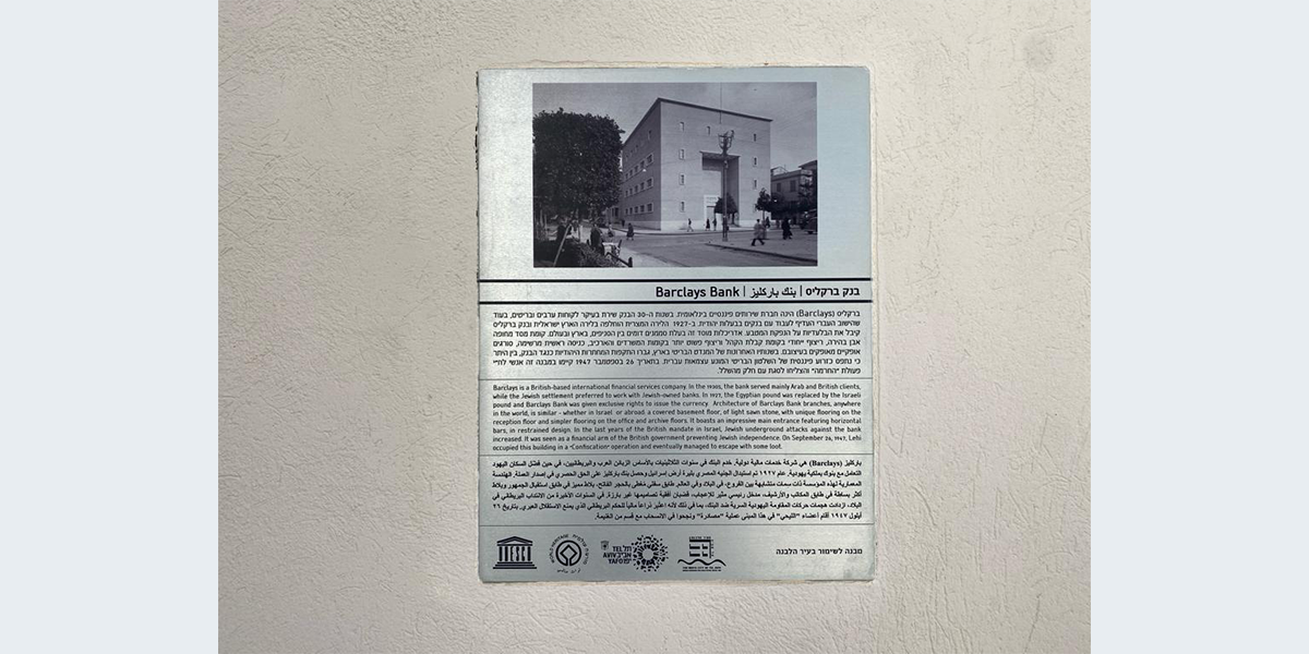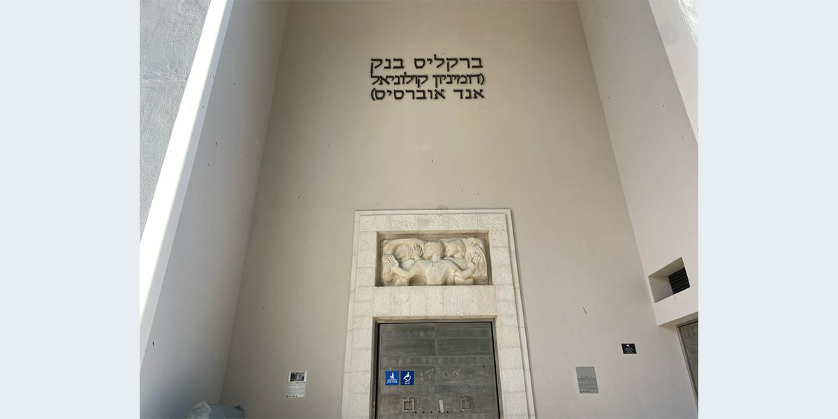 הדמות המרכזית בתבליט מניפה ידיים ופונה הצידה כמו באמנות המצרית, ומאחוריה נראות עוד דמויות. את התבליט יצרה ככל הנראה פרנסס ברוס האברד, אשת האדריכל הבריטי פירס האברד שתכנן עם האדריכל קליפורד הולידיי מבנים בארץ בתקופת המנדט הבריטי, ובהם בנק ברקליס. יש הטוענים שאת התבליט פיסל הפסל הבריטי אֶריק גיל ששהה בארץ בשנים 1934 ו־1937.