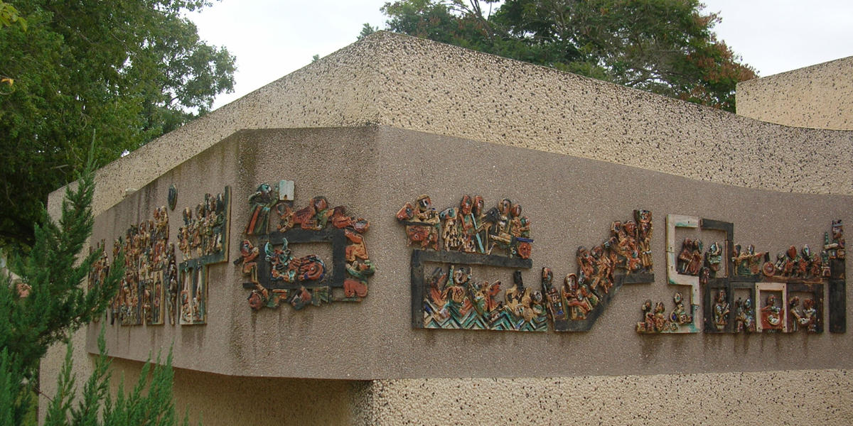 מסעי בני ישראל במדבר באפריז קרמיקה ארוך התלוי על שני קירות ניצבים של חדר האוכל.