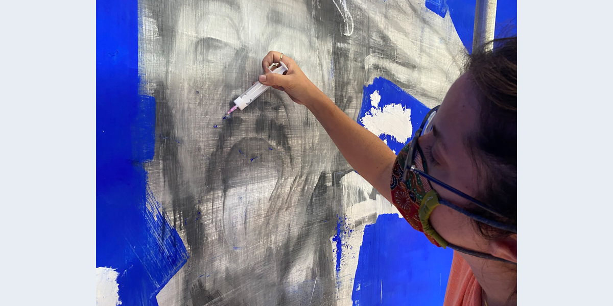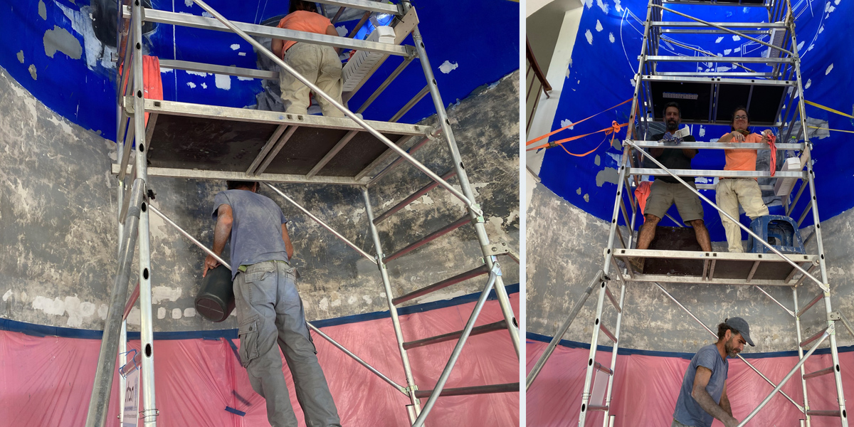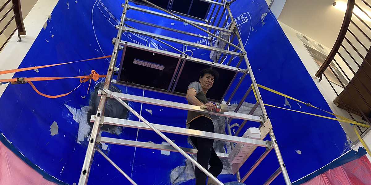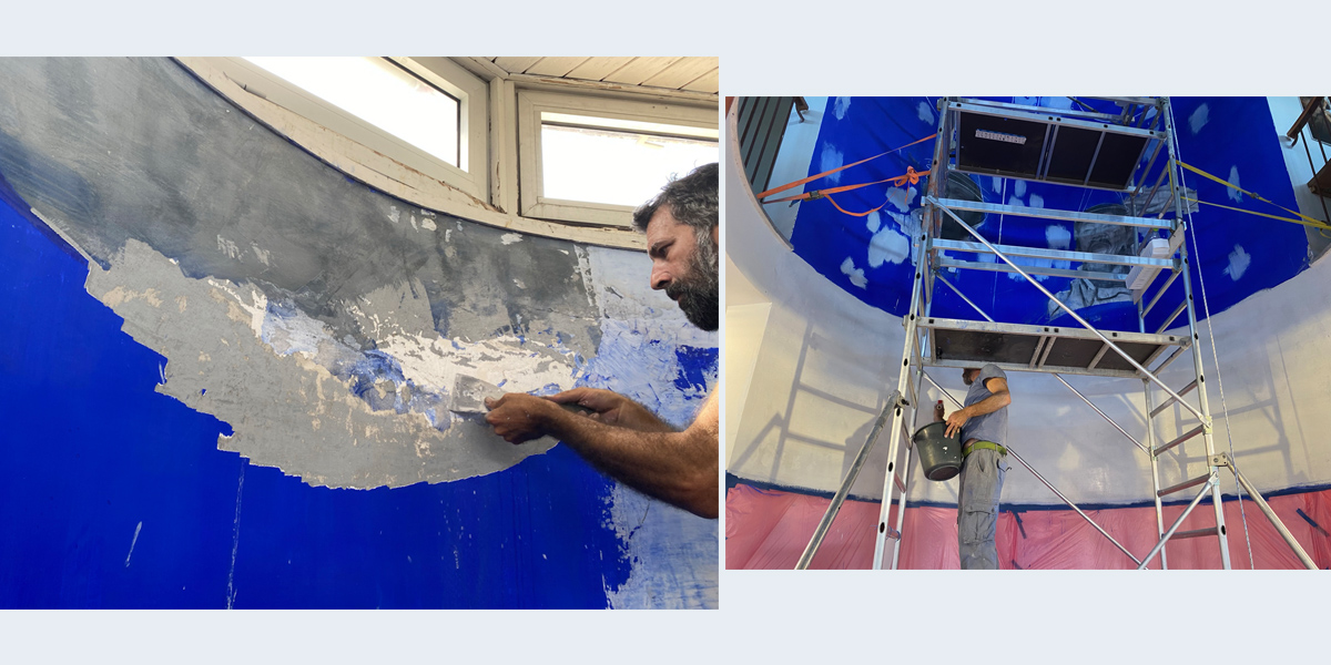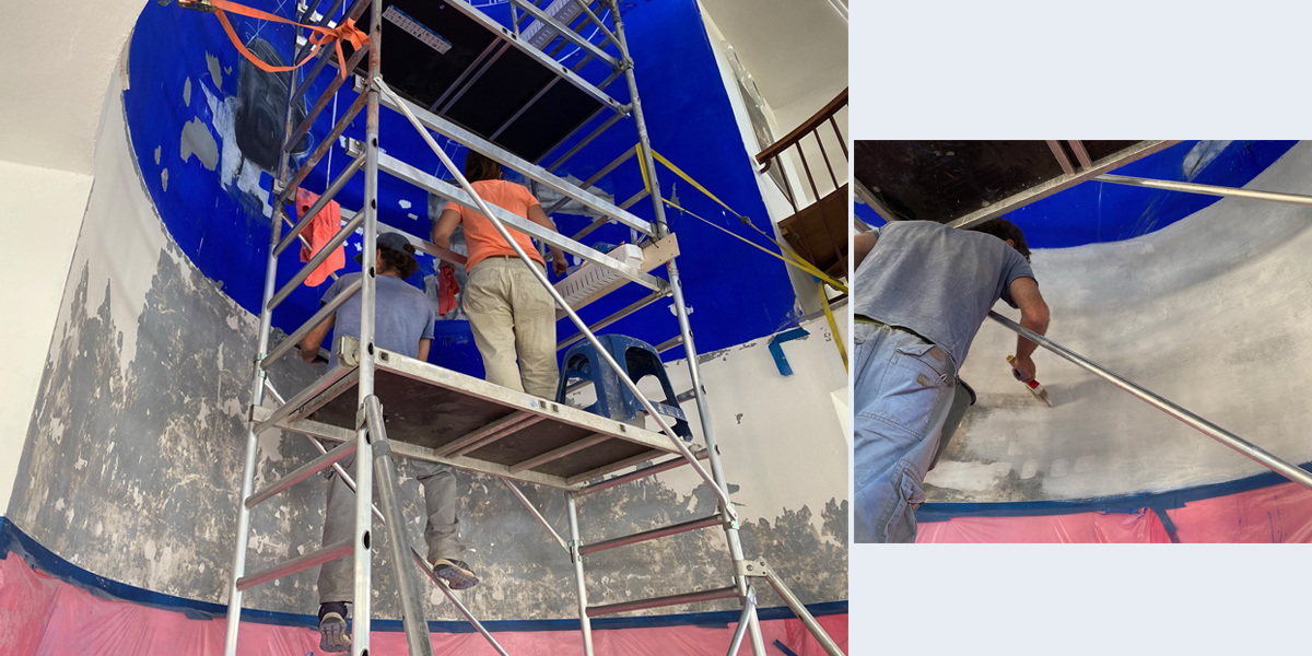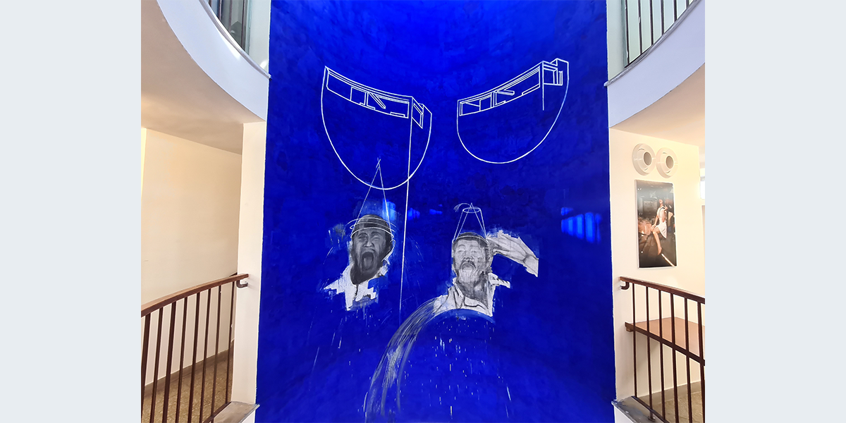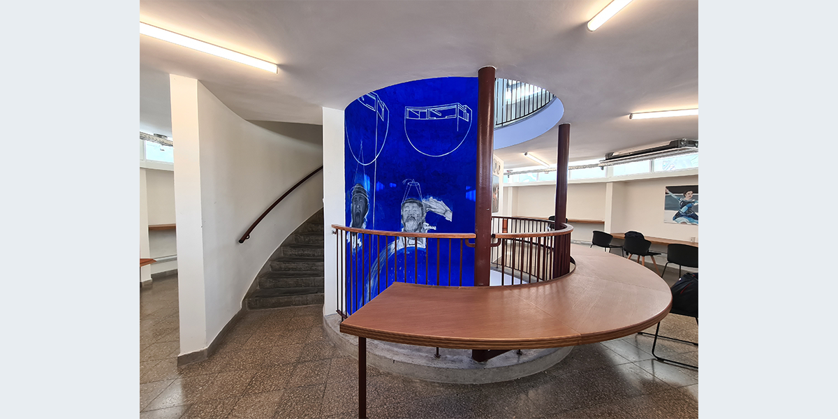 - זיקה ערכית ורגשית – תמר גטר, בת למשפחה מרקע סוציאליסטי, ילידת גבעתיים של תנועת העבודה ההיסטורית, המתגוררת בה עד היום, נענתה להזמנה לפרויקט בגבעת חביבה מתוך זיקה עמוקה למקום ולערכים הסימבוליים שהוא מייצג, ומתוך חרדה אמתית שלה – של כולנו – למרחק שנוצר מהחזון המקורי. "הבחירה שלי ושל טלי תמיר למקם את הציור בתוך צינור האור/אוויר של הספרייה המיוחדת הזו הייתה בחירה הכי סימבולית ואמוציונלית שאפשר להעלות על הדעת. כמובן מסטצ'קין עצמו היה הראשון לדמיין ולשאוף לציר כזה בלב הפרויקט הנפלא שלו" – דברי תמר גטר. ואכן, ציור הקיר הכחול של גטר מדגיש את הרעיון והמחשבה של החלל המרכזי הנפתח אל הקומות העליונות וחוצה אותן, בלב המדומיין והנעדר של הספרייה האידאולוגית שהייתה".