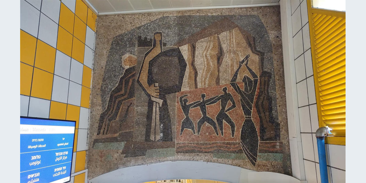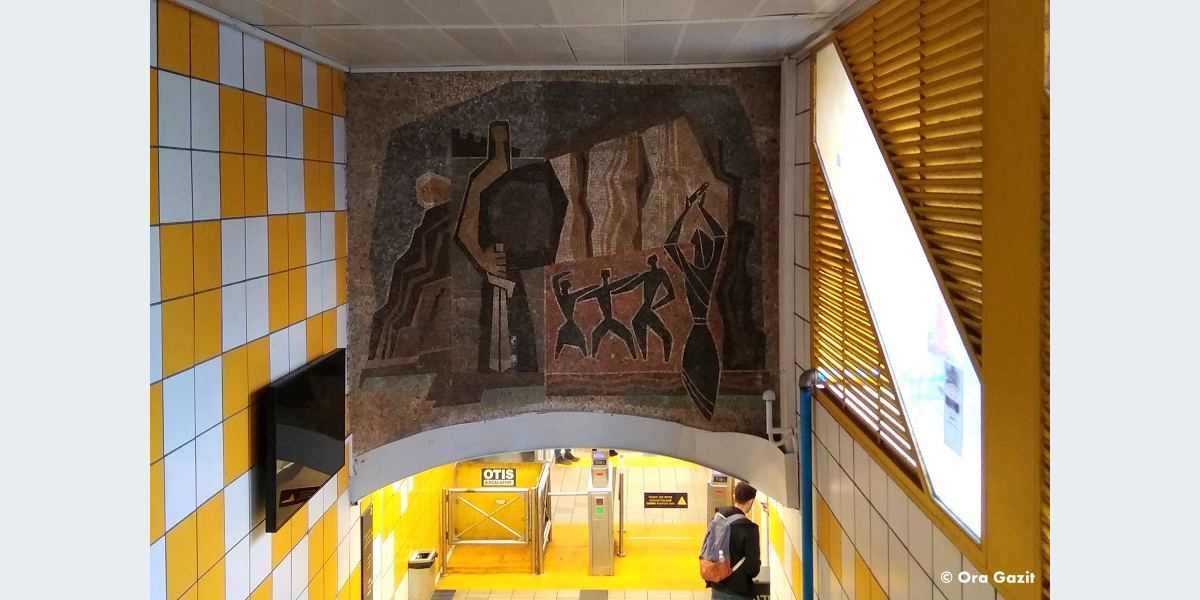 בפסיפס הנמצא על תקרת גרם המדרגות בכניסה לחלל התחנה, נראות דמויות מנגנות ומחוללות.
