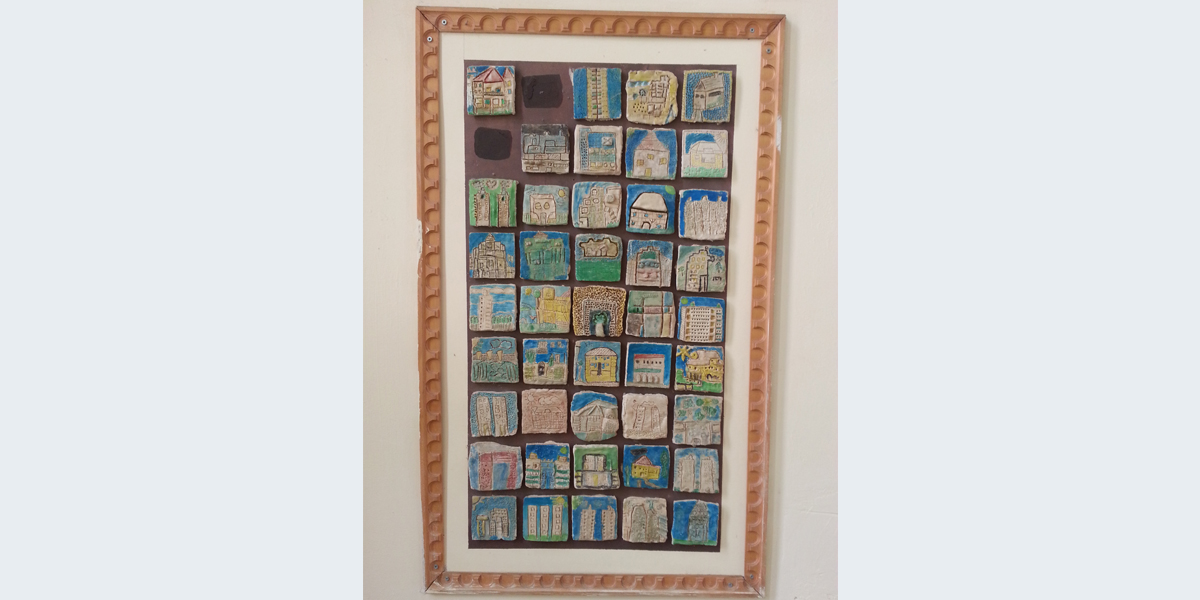 עבודה התלויה בבית הספר "אופק" במודיעין־מכבים רעות שעשו ילדי כיתות ה על בסיס תצלומים מן העיר מודיעין.
