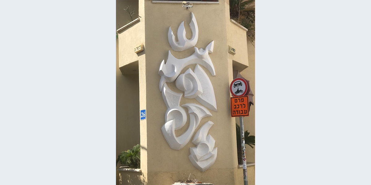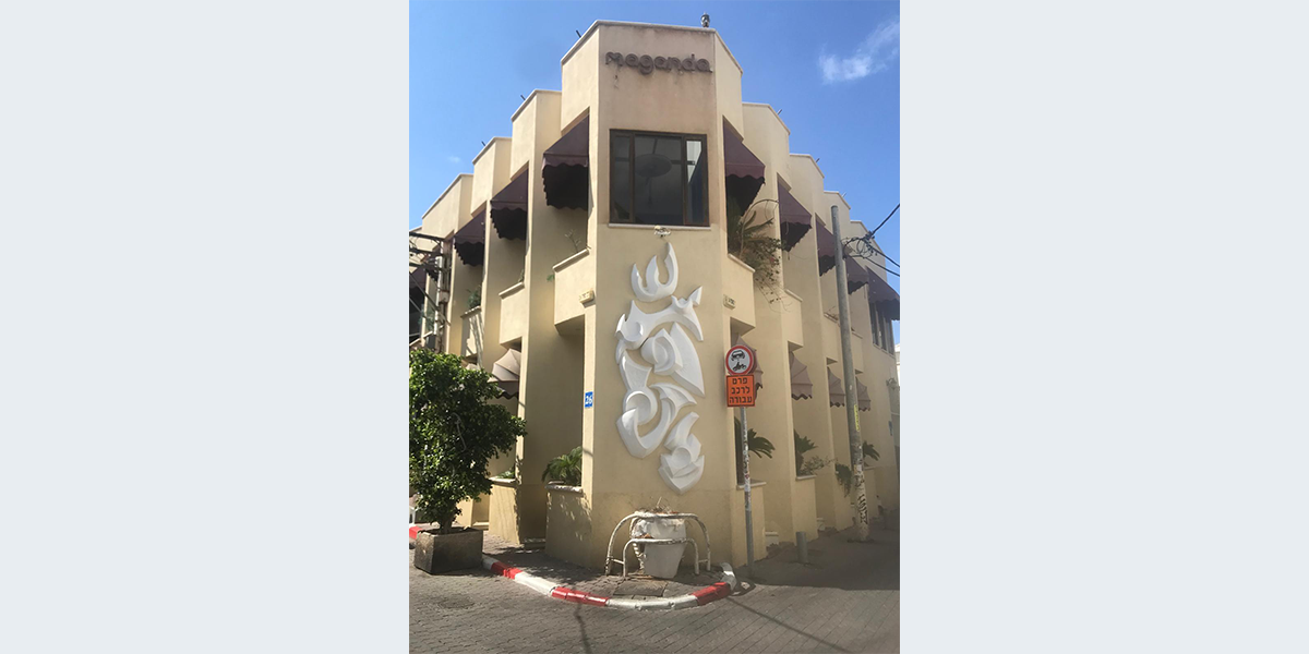 את העבודה המוצבת על קיר מסעדת מגנדה בכרם התימנים יצרה האמנית בת שבע דנוך ילידת השכונה בעת לימודיה במכון אבני. לדבריה, בבסיס העבודה יש מבנה מתכת, מעליו הניחו גושי קלקר (המפחיתים את משקל העבודה) ועל הכול יצקו בטון ממלט לבן. צורת העבודה מופשטת, אך האות שי"ן שבראשהּ מרמזת על יונת השלום.