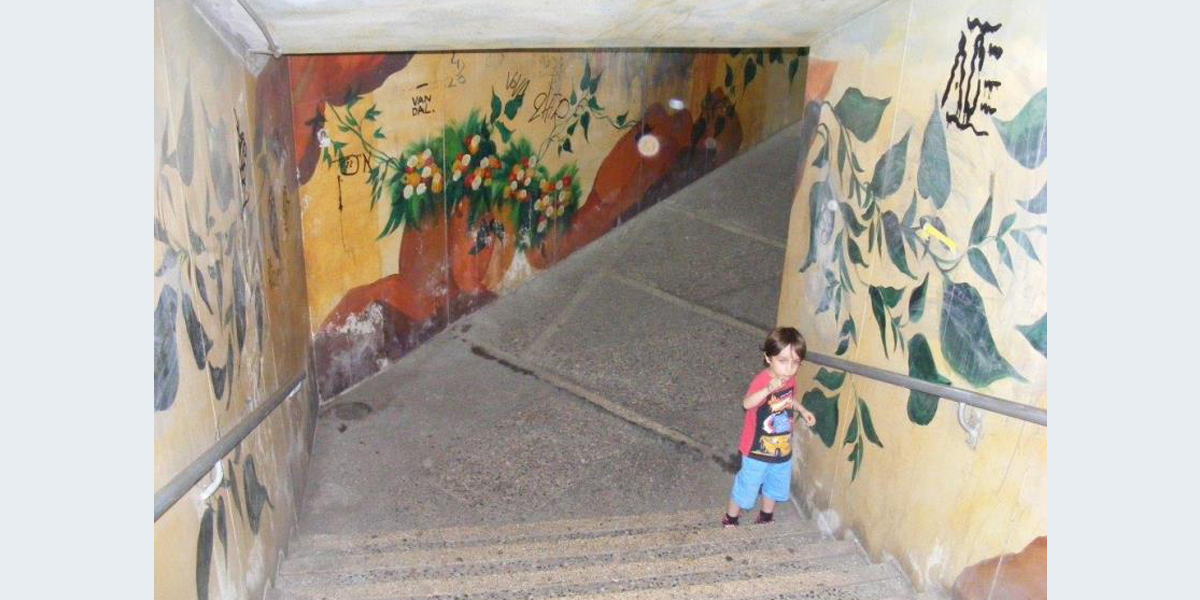 על דפנות המנהרה המחברת בין רחוב מוריה ומרכז חורב מצוירים פרחים, ענפים ועלים הבוקעים מתוך כדים.