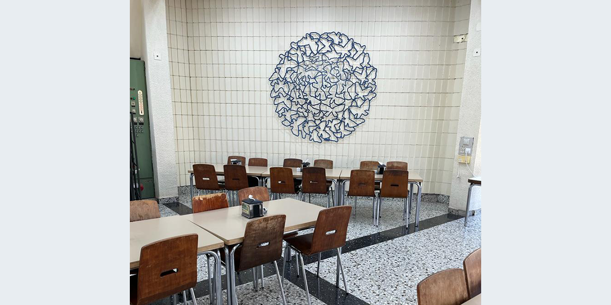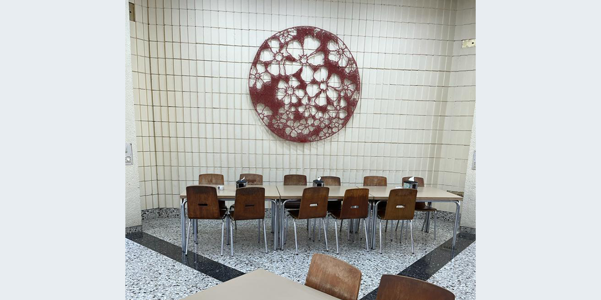 כיוון שבמשך הזמן הקיר הקרמי שעיצבה גיה זילבר נצבע בלבן, הורגש צורך בקישוט אחר, והמסגר חבר הקיבוץ נדב פיינשטיין יצר את העיטורים הללו.