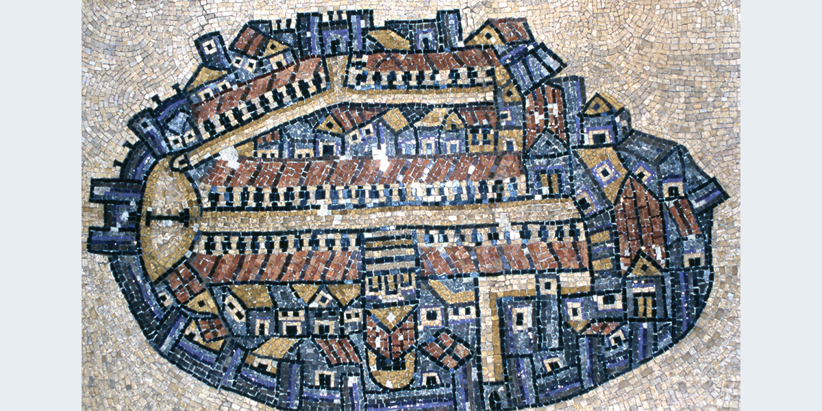 באחת הפינות בקרדו מוצב העתק מפת ירושלים מתוך פסיפס מפת מידבא. המפה התגלתה ב־1884 בכנסיית גאורגיוס בעיר מידבא שבירדן, מתוארכת למאה השישית ומשמשת כמסמך ויזואלי הקדום ביותר של ירושלים הביזאנטית. הכתובת ביוונית: עיר הקודש ירושלים. משמאל שער שכם (באב אל־עמוד) עם העמוד, ממנו נמשך הקרדו עם שורת העמודים מכל צד.