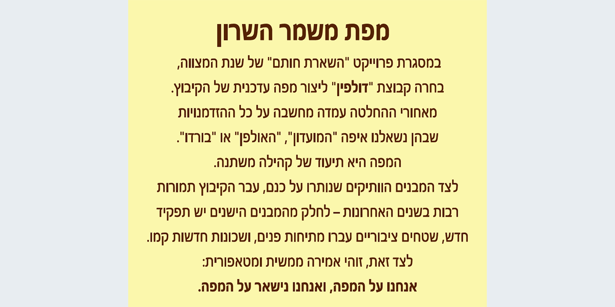 בקיץ 2025 במסגרת מיזם "השארת חותם" של שנת המצווה, בחרה קבוצת "דולפין" ליצור מפה עדכנית של הקיבוץ. מאחורי ההחלטה עמדה מחשבה על כל ההזדמנויות שבהן נשאלנו איפה "המועדון", "האולפן" או "בורדו". המפה היא תיעוד של קהילה משתנה: לצד המבנים הוותיקים שנותרו על כנם, עבר הקיבוץ תמורות רבות בשנים האחרונות – לחלק מהמבנים הישנים יש תפקיד חדש, שטחים ציבוריים עברו מתיחות פנים, ושכונות חדשות קמו. לצד זאת, זוהי אמירה ממשית ומטאפורית: אנחנו על המפה, ואנחנו נישאר על המפה.