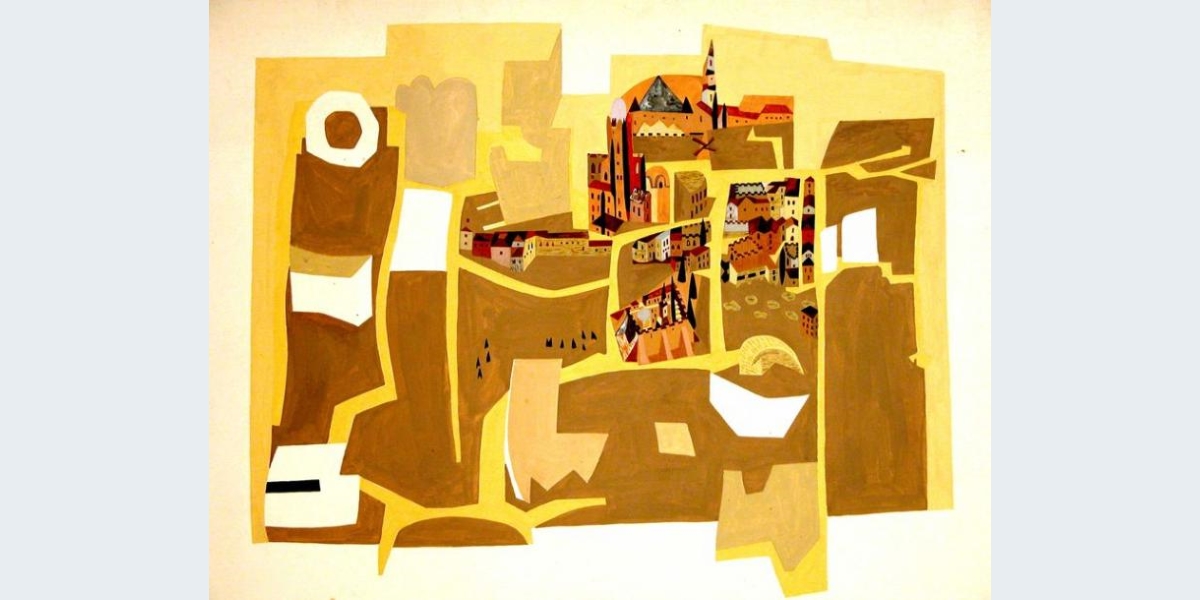 היצירה היא מעין תיאור ממעוף ציפור של עיר או יישוב, ובו מבנים ורחובות.